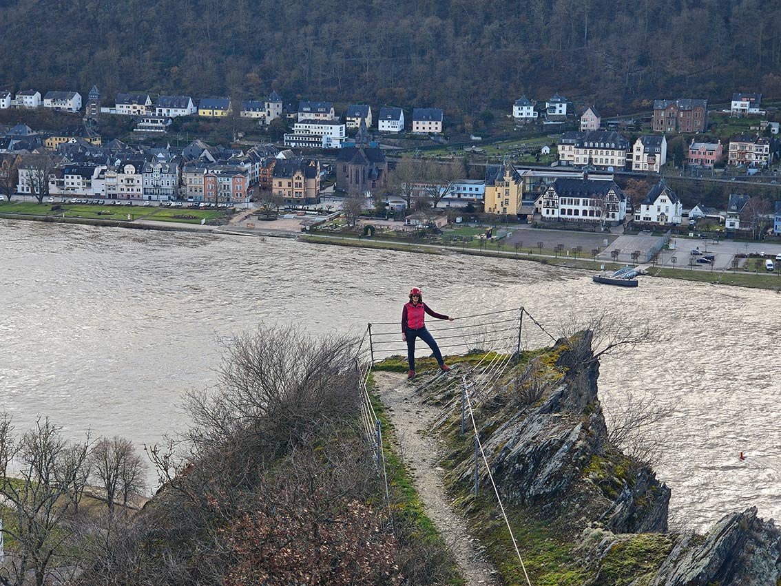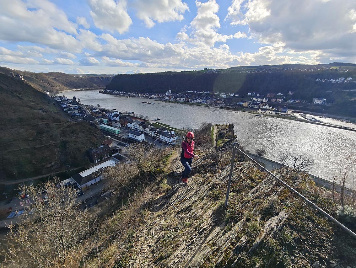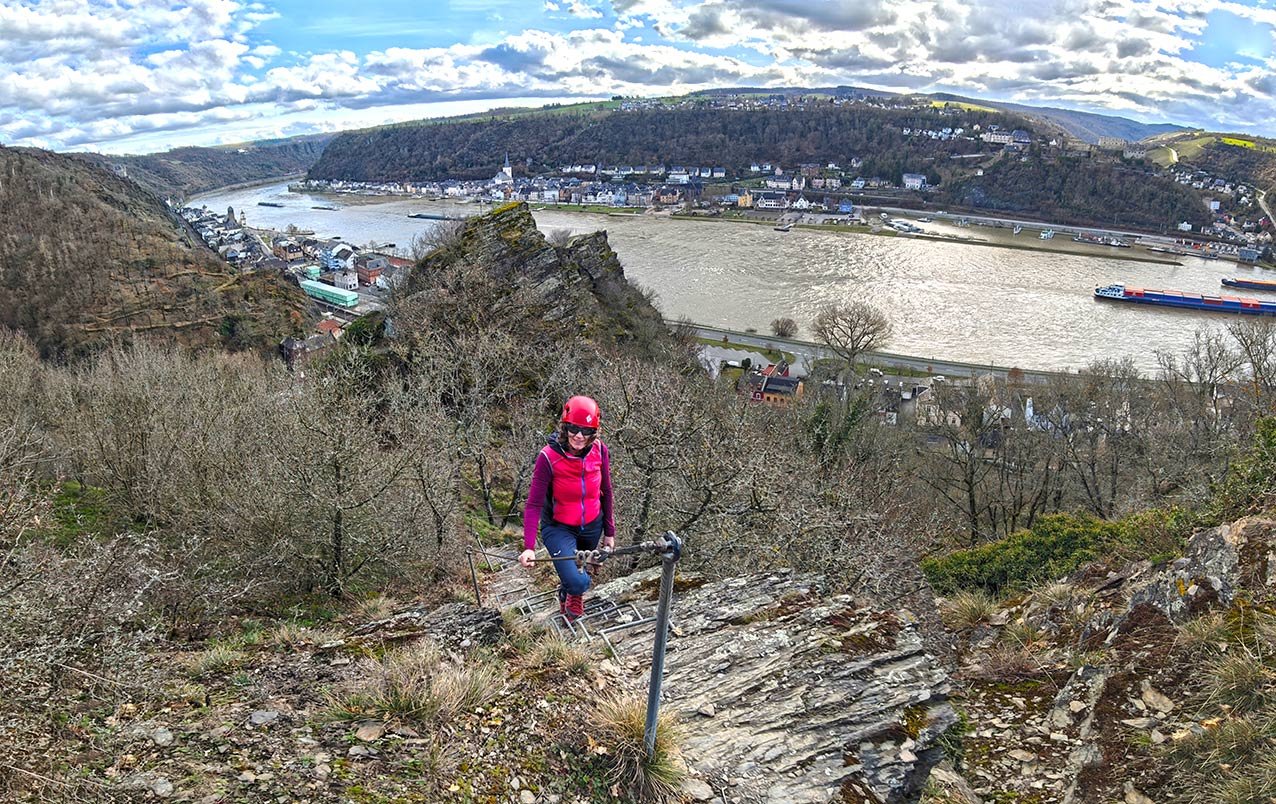 Der Rabenacksteig ist ein einfacher, mit Stahlseilen und Klammern versicherter Klettersteig oberhalb von St. Goarshausen am Rhein. Ein Steig mit alpinem Charakter, welcher als Ziel die Felsnase "Rabenack" hat. Kurze Stufen mit Trittklammern und eine lange, recht ausgesetzte Leiter sind die "Highlights" dieses Steiges. Der Rundweg ist kein "richtiger" Klettersteig und wird als Variante des Rheinsteiges von unzähligen Wanderern gerne mitgemacht. Wer eine einfache, aber doch etwas ausgesetzte Tour sucht, um in die Welt der Klettersteige ganz gemächlich einzutauchen, ist an den Felswänden von Sankt Goarshausen aber genau richtig.
