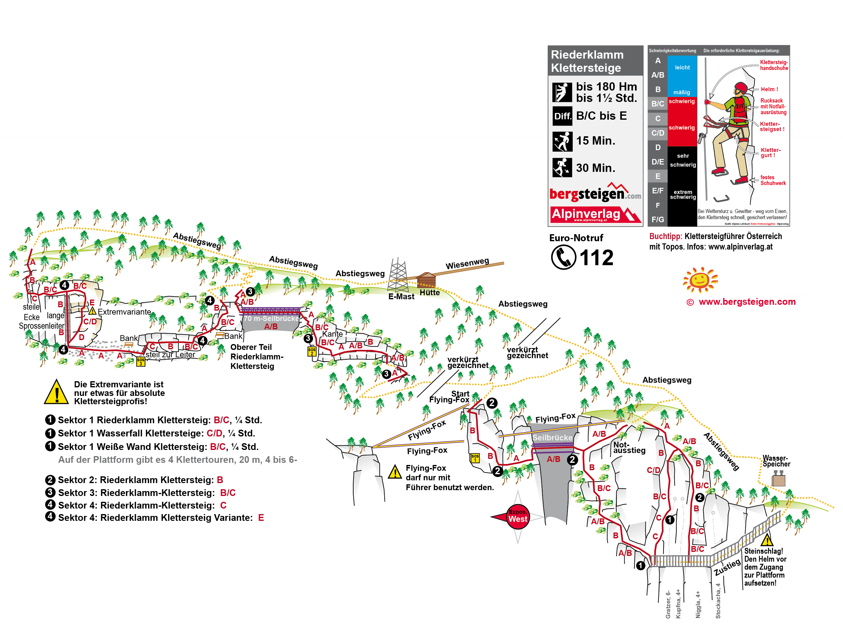 Der lange Klettersteig ist B/C - nach der 70 m-Seilbrücke folgen Stellen C und eine Varianten E. Die kurzen Übungsklettersteige am Beginn bei der Plattform sind C/D und B/C. Siehe Topo.