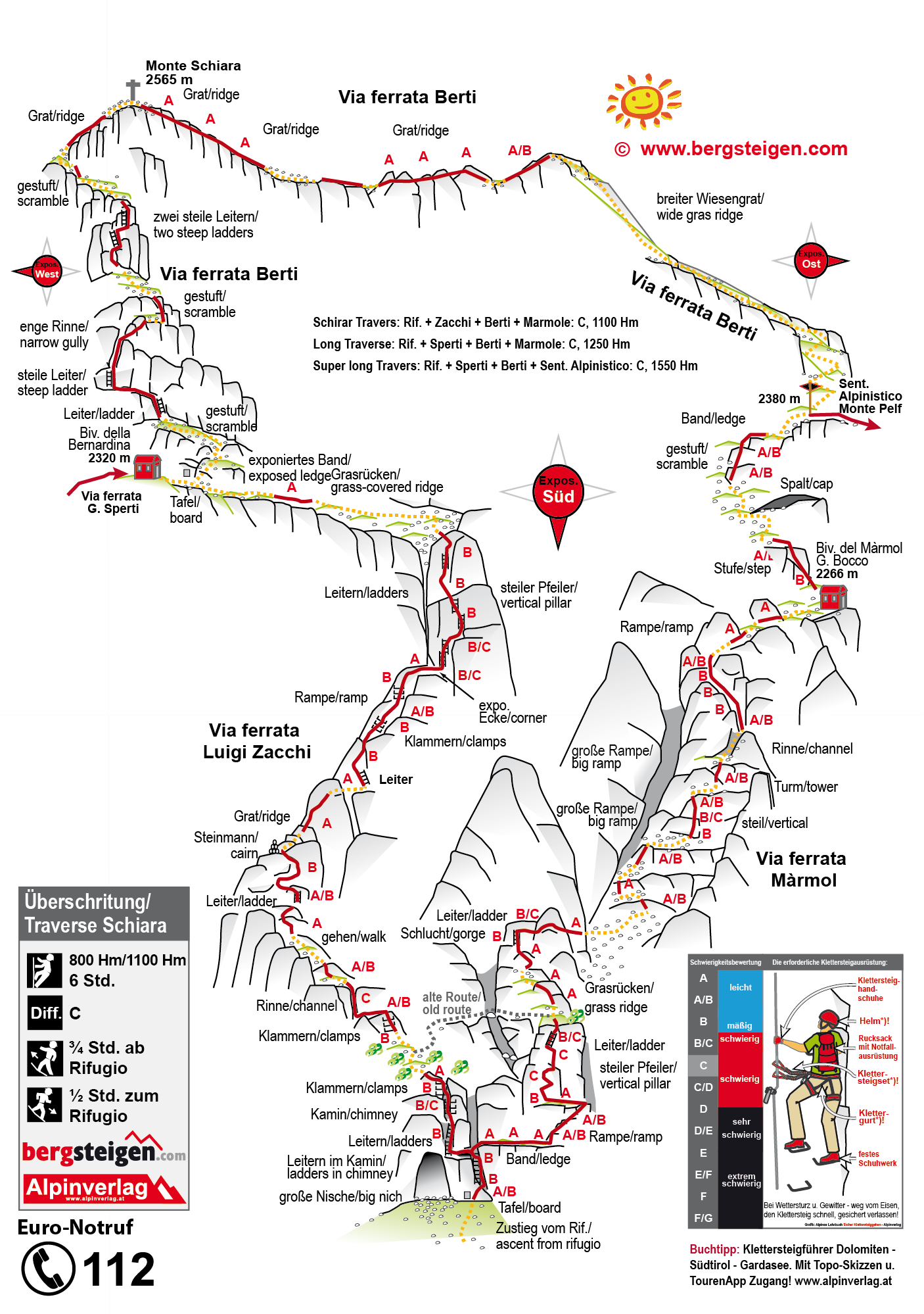 Ferrata Zachi, Ferrata Berti, Ferrata Marmol jeweils Stellen C - Zustieg über Ferrata Sperti (B/C) und Abstieg auf dem Sentiero Alpinistico (B/C), C-Stelle aber in der Gipfel Ferrata Berti.