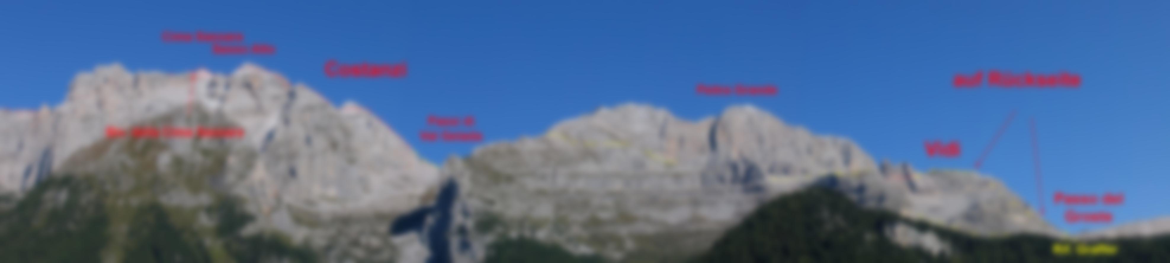 Sehr lange, ernste und alpine Tour, die nur bei perfektem Wetter und mit entsprechender Erfahrung gemacht werden sollte. Besonders lohnend und kaum länger ist die Kombination mit dem Sentiero Gustavo Vidi (A/B), Start am Passo Grostè, 2446 m (für Leute mit sehr guter Kondition, die am Morgen mit der Seilbahn auffahren).