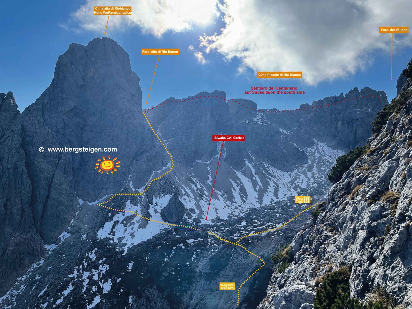 Von der Parkmöglichkeit entlang der SP 76 über den markierten Weg 625 durch das Weißenbachtal (Val Rio Bianco) aufsteigen. Am unbewirtschafteten Rifugio Brunner (1432m) vorbei, macht der Weg auf ca. 1600m einen Knick nach Westen. Auf 1950m erreicht man die beiden Biwakschachteln CAI Gorizia, die man auch als Übernachtungsmöglichkeit nutzen könnte. Nun in südlicher Richtung über Schotter zur Weißenbachscharte (Forcella alta di Rio Bianco, 2150m) aufsteigen. Hier beginnt der Klettersteig (silberne Tafel am Fels.)