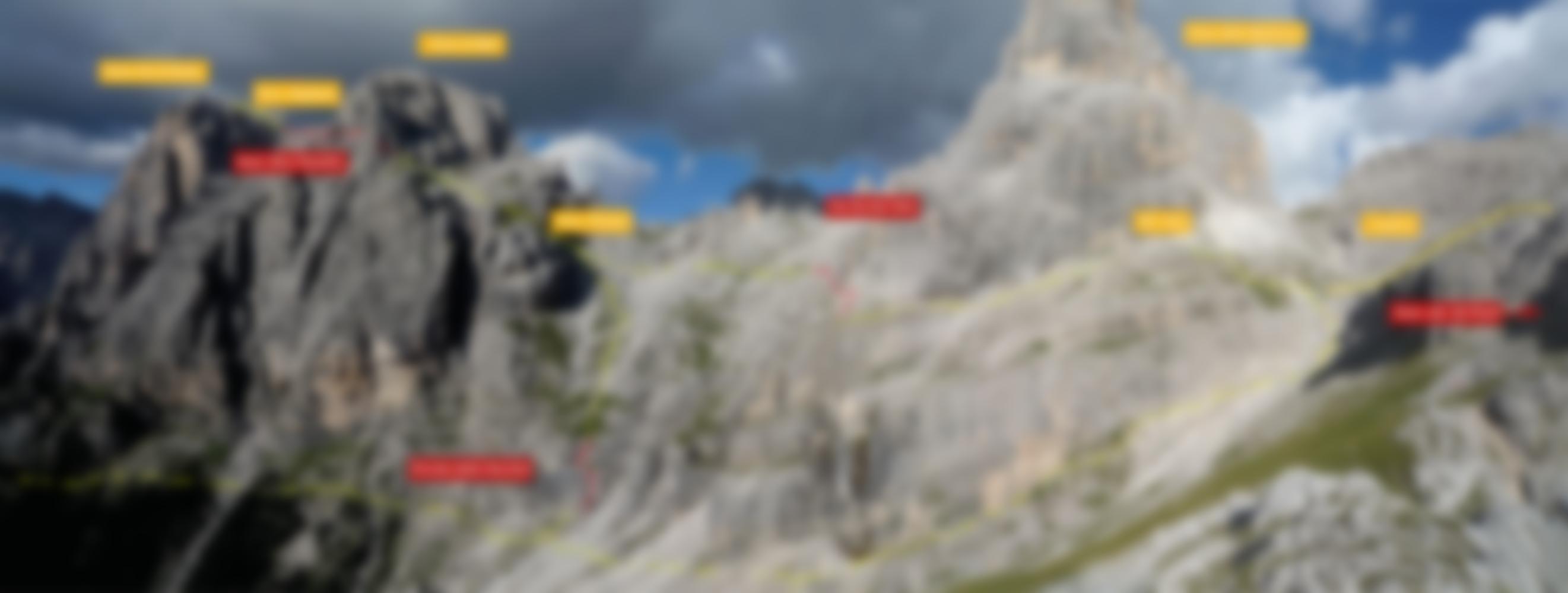 3) Geradeaus dem Weg 739, Via ferrata del Velo (B/C) unter die Cima d. Madonna folgen. Anfangs ein gutes Stück im Gehgelände, bis bei einer Platte die Versicherungen beginnen (N46.23411, E11.84558). Man steigt neben einer Rinne auf ein Band ab (A/B) und quert zu einer Plattenzone, die man im Abstieg (B/C) zu einem weiteren Band überwindet; Ende der Versicherungen. Weiter unschwierig zu dem nahe gelegenen Rif. Velo.