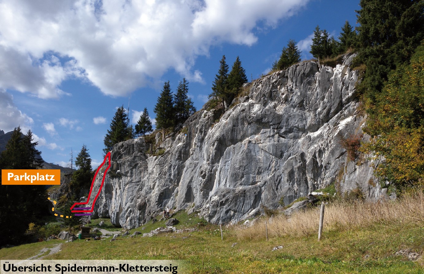 Über den Block (B) zur Wand, steil hinauf (C) bis oben nach rechts gequert wird (B, am Ende der Querung ist auch ein Ausstieg auf die Wiese möglich). Dann wieder hinunter (C) und über die Seilbrücke (B) wieder zu Block und über 2 Klammern (A/B) auf den Weg.