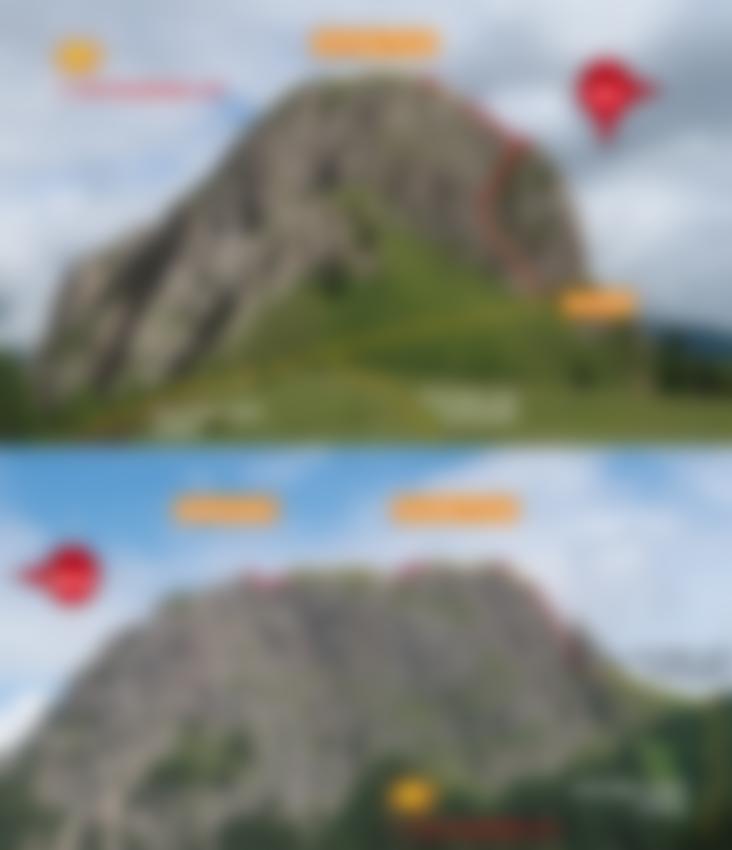 Durch eine Kaminreihe (A/B und Gehgelände) und über eine gestufte, teilweise erdige und zuletzt grasige Rampe (max. A/B) zu einem steilen Grashang (A) und auf den höchsten Punkt. Im Gehgelände zu einem gestuften Grat (A) und diesen abklettern. Abermals im Gehgelände zu einer Scharte (A). In diese abklettern und auf der anderen Seite hinauf zum Gipfelkreuz.