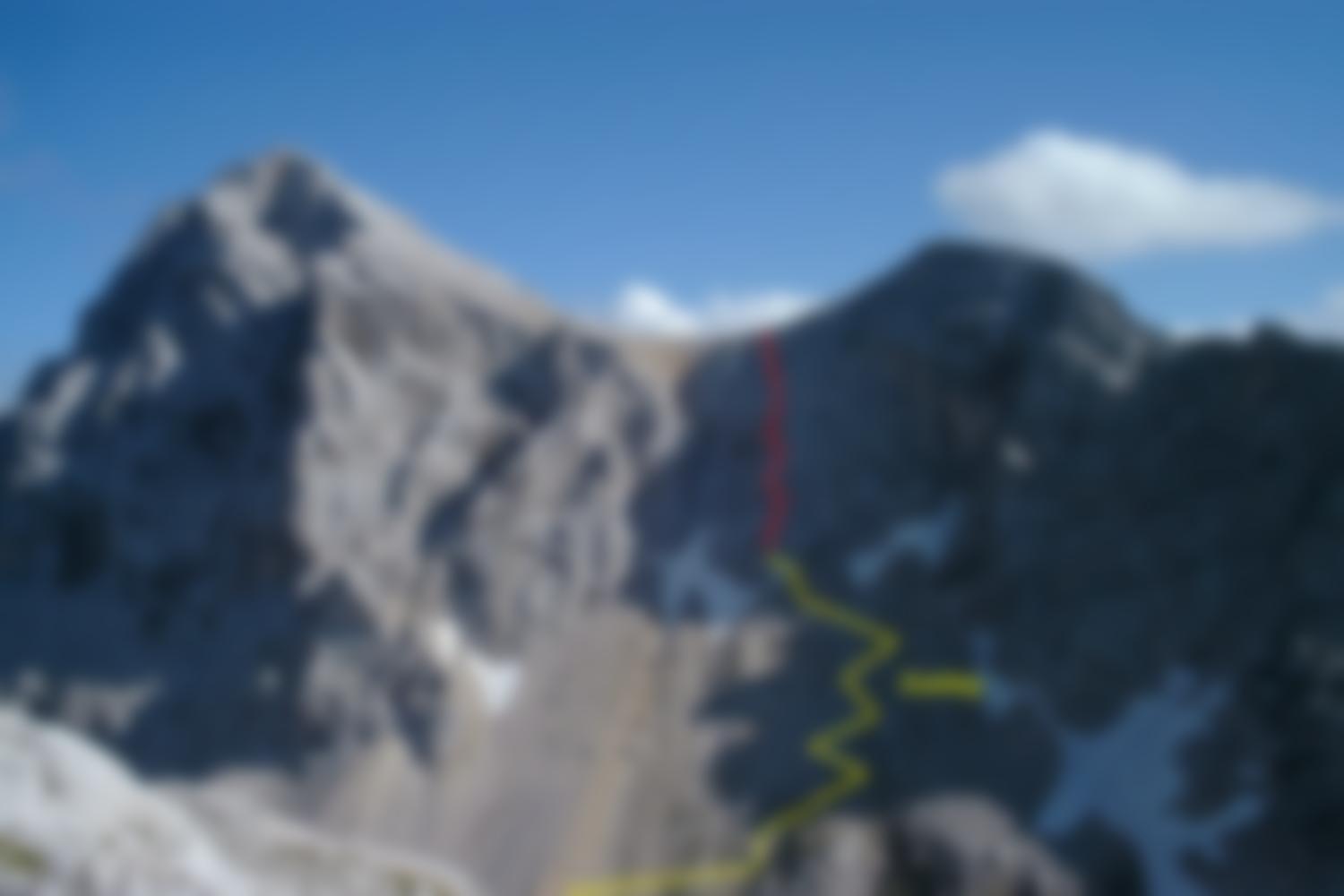 Kompl. Klettersteigausrüstung, Helm . Beim Zustieg im Frühjahr sollten die Altschneefelder nicht unterschätzt werden.