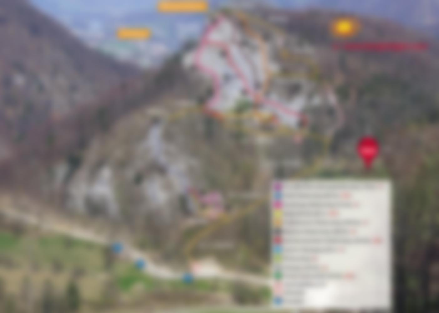Die Felswand wurde im wahrsten Sinne des Wortes systematisch mit Klettersteigen überzogen. Die Infotafel zeigt gleich was ab geht, vom Übungsklettersteig „The little Rock“ (Stelle C) bis zur megaschweren „Mammut-Route“ (solide und recht anhaltend E) reicht die Auswahl. Der Trattenbacher Klettersteig ist die leichteste Möglichkeit in der oberen Wand der Beisteinmauer über die lange Seilbrücke und die spektakuläre Aluleiter zum Gipfel zu steigen.
