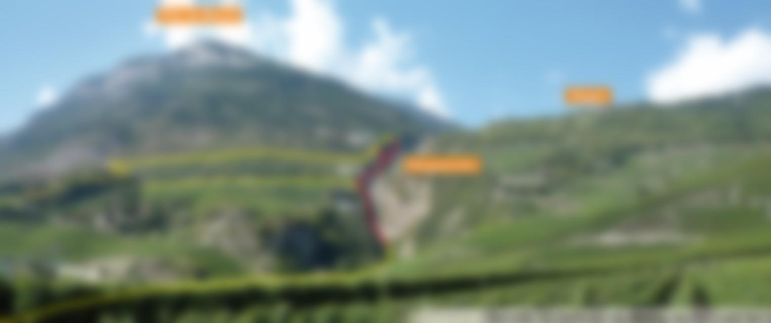 Vom Ausstieg links hinunter zum Schotterweg bei der Hängebrücke und rechts auf markiertem Weg zurück zum Burghügel von Saillon. Vom Ausstieg des ersten Teils links auf markiertem Weg in Richtung Burghügel und zurück in den Ort. Keine weglosen Abzweiger durch die Weinberge machen! Alternativ kann man die Hängebrücke überqueren und von Les Places absteigen bzw. an der Straße das Postauto ins Tal nehmen.