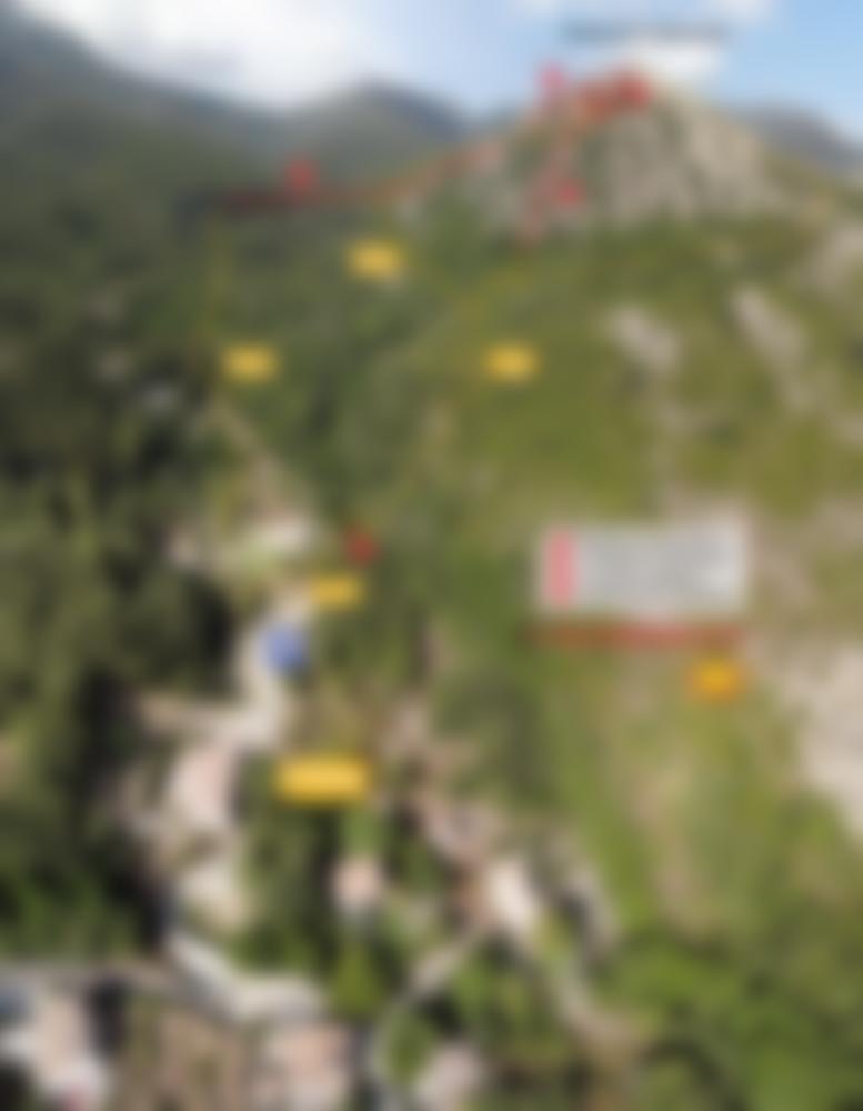 Ein Seil führt hinab zur 50 m langen, recht wackeligen Tibet-Brücke (3-Seil-Brücke mit zusätzlichem Sicherungsseil darüber) ohne seitliche Satbilisierungsseile. Danach folgt eine Hängebrücke mit Trittbrettern. Nach kurzem Gehglände gelangt man zur 100 m langen Tyrolienne “U Pinu”. Rechts befindet sich das Sicherungsseil (“longe”). Auch hier gilt zuvor empfohlenes. Auch hier gibt es vor dem Landepunkt ein Karabiner mit Bremsseil von unten. Es folgt anschließend gleich nächste Seilrutsche, die 80 m lange “U Ditu” zu einem Felszacken, den ein Fahnenmast ziert. Bei dortigem Landepunkt hängt das Bremsseil von oben, geführt von einem dritten Seil. Anschlißend läuft man über eine 3-Seil-Bücke und eine Hängebrücke bergab zum Highlight: der 230 m langen Tyrolienne “U Pitricaghju” hinab ins Tal. Auch hier gibt es rechts vom Rollenseil ein Sicherungsseil (“longe”) und vor dem Landepunkt ein Bremsseil von unten. Bei Landepunkt endet der Klettersteig (65 min.).