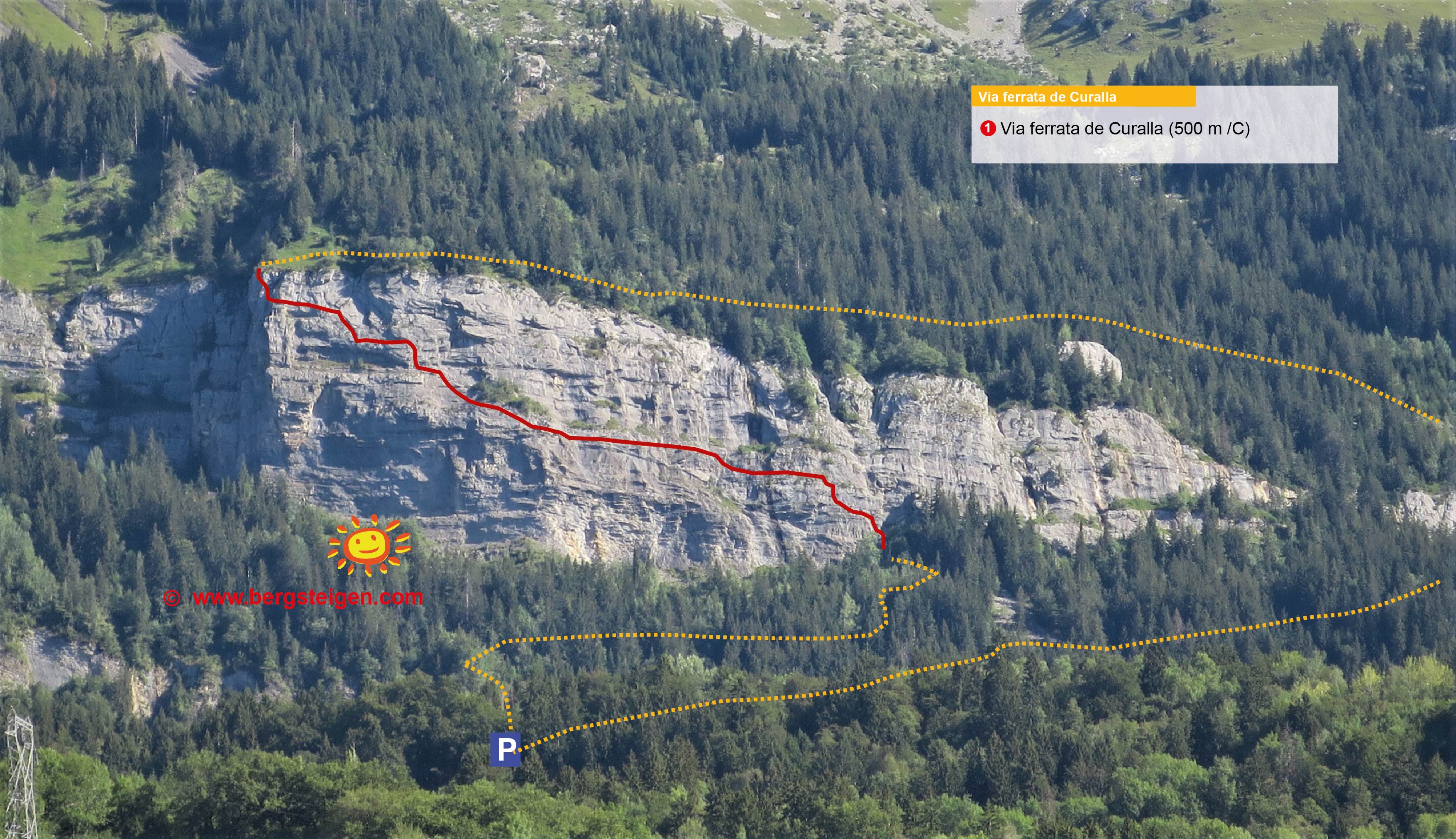 Die Via ferrata de Curalla quert an einer der vorgelagerten Felsklippen unter der Aguille de Varan. Der Steig bietet auf seinen rund 500 Metern Kletterlänge konstante Schwierigkeiten im Bereich B bis C und einen grandiosen Blick auf den Mont Blanc. Da kann man schon mal über den Umstand, dass der Steig schon sehr glatt-geklettert ist, hinwegsehen, zu erhaben blickt der höchste Berg der EU mit seinen riesigen Gletschern auf einen herab. Die Sonne tut es in dieser Südwand auch und zwar nahezu den gesamten Tag, deshalb bitte ausreichend Flüssigkeit in die Tour mitnehmen!