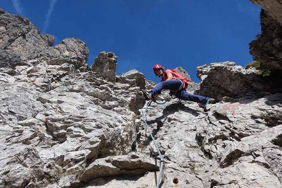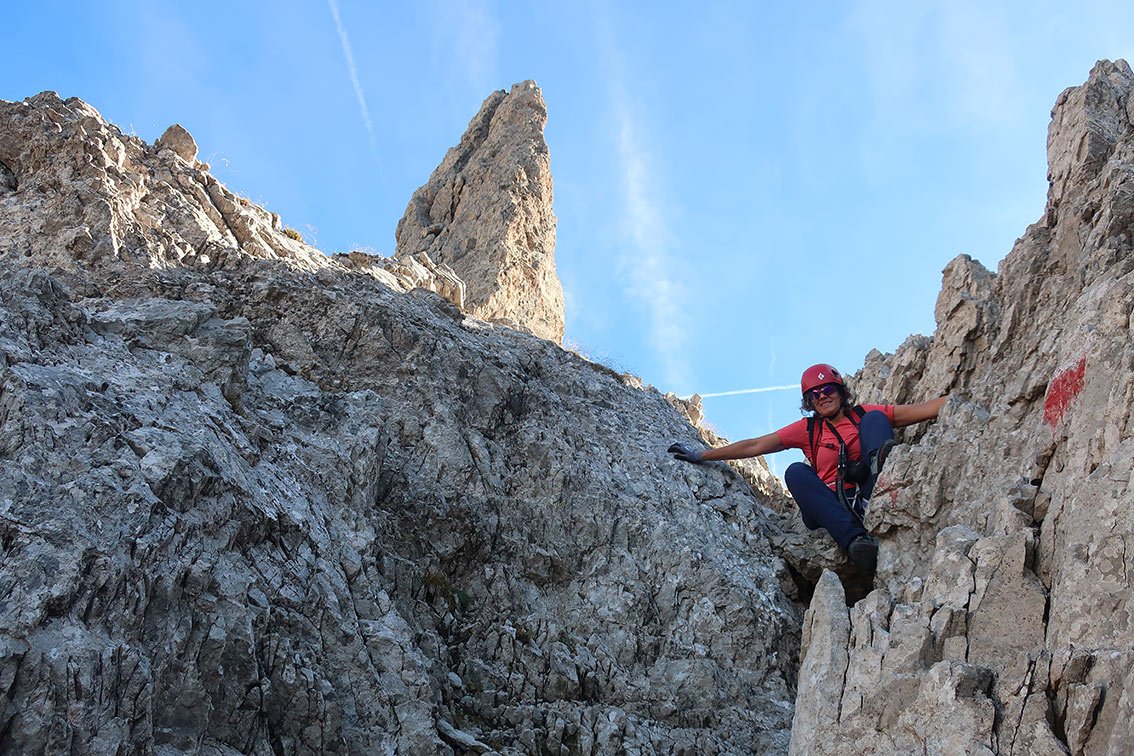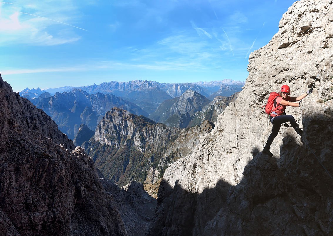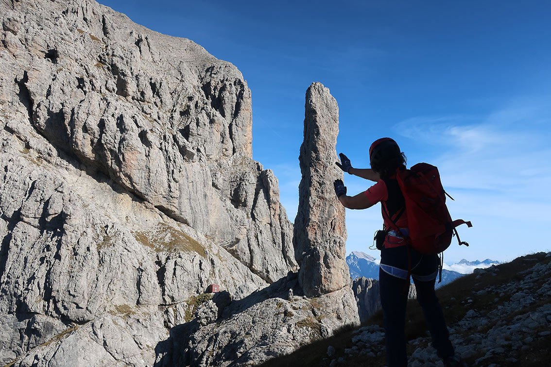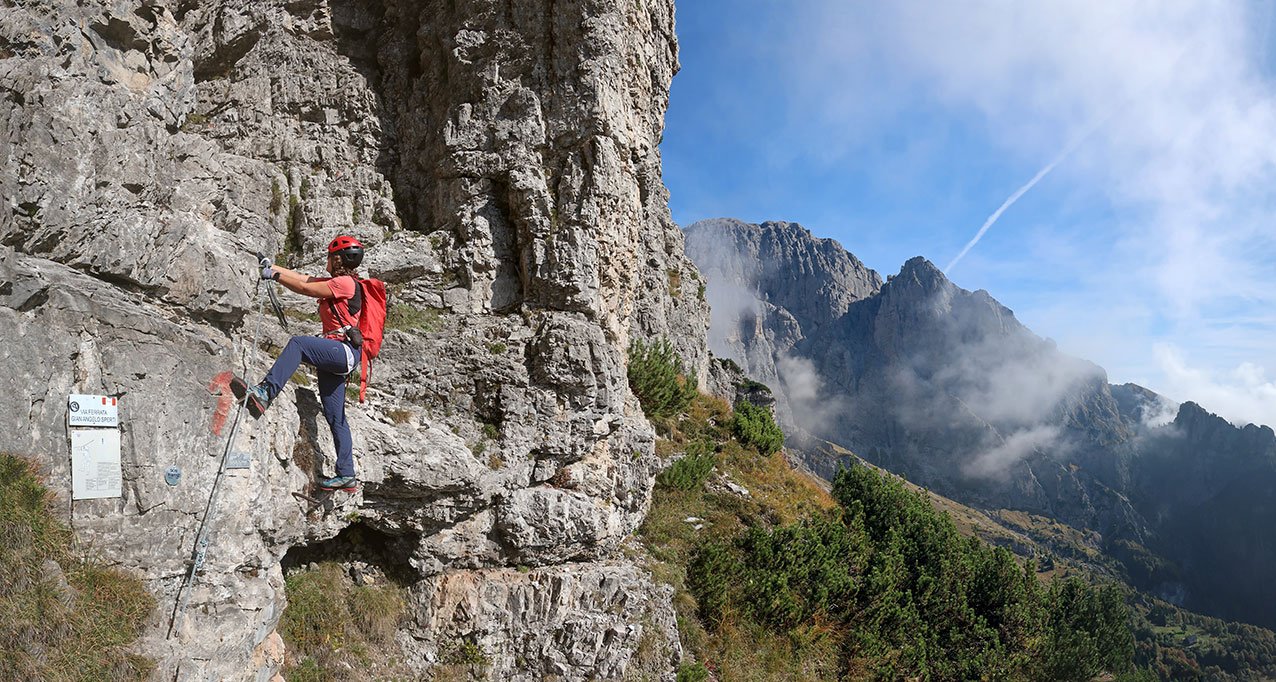 Von den Schiara-Klettersteigen gehört die Ferrata Sperti sicher zu den wildesten, steigt man doch oben direkt durch eine große Schlucht auf den Schiara- Kamm. Gerade dieser Umstand macht den Steig zum attraktiven Ziel. Man ist meist mit wenigen Gleichgesinnten unterwegs. Hat man den Kamm erreicht und die zahlreichen kleinen Stufen an der Rückseite gemeistert, steht man direkt beim Felsenfi nger „Gusela del Vescova“ - einem der Schiara-Wahrzeichen. Je nach Ausdauer und Kondition steigt man danach entweder über die Ferrata Zacchi ab oder hängt die Ferrata Berti zum Hauptgipfel der Schiara an.