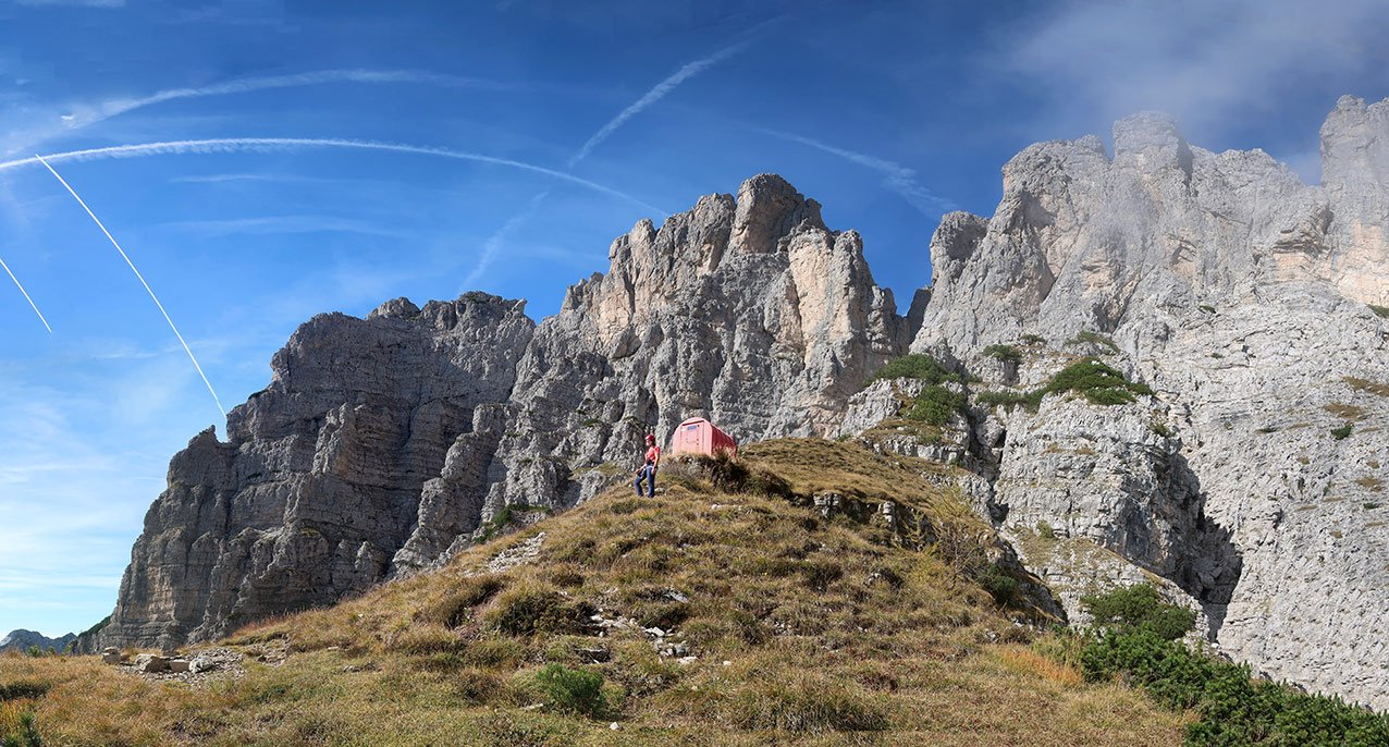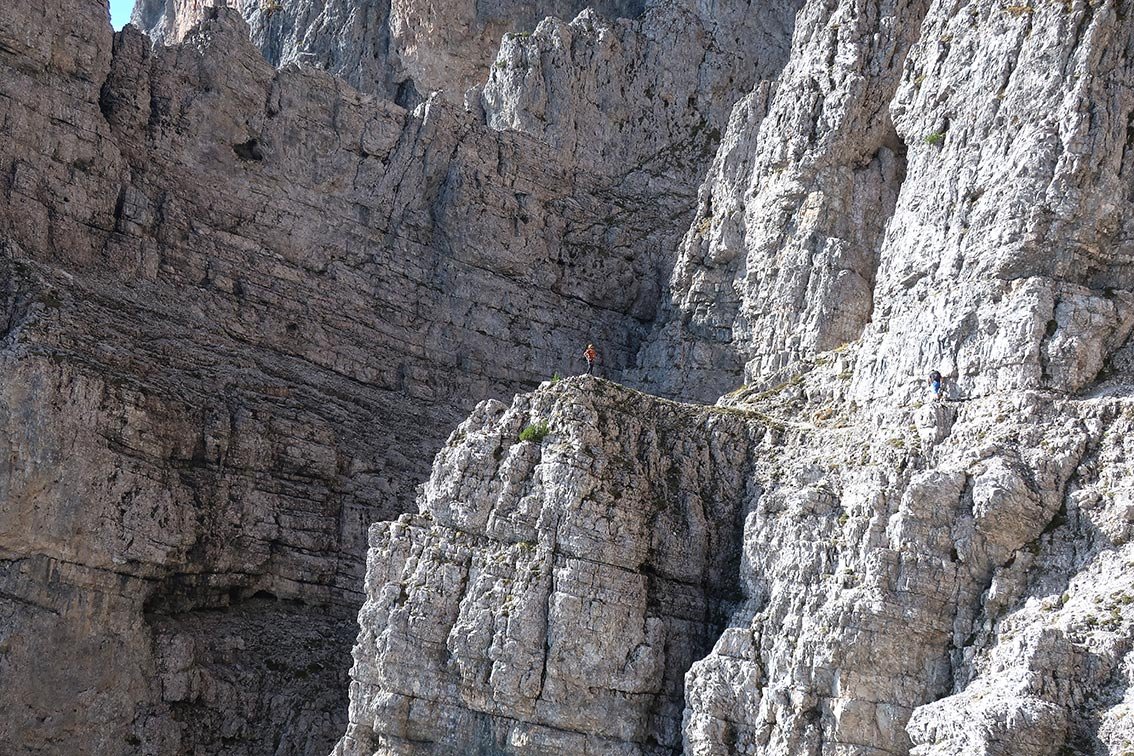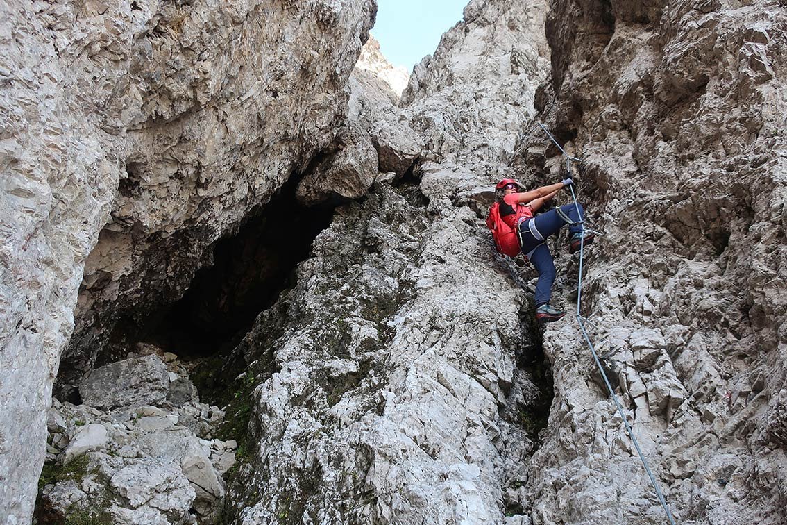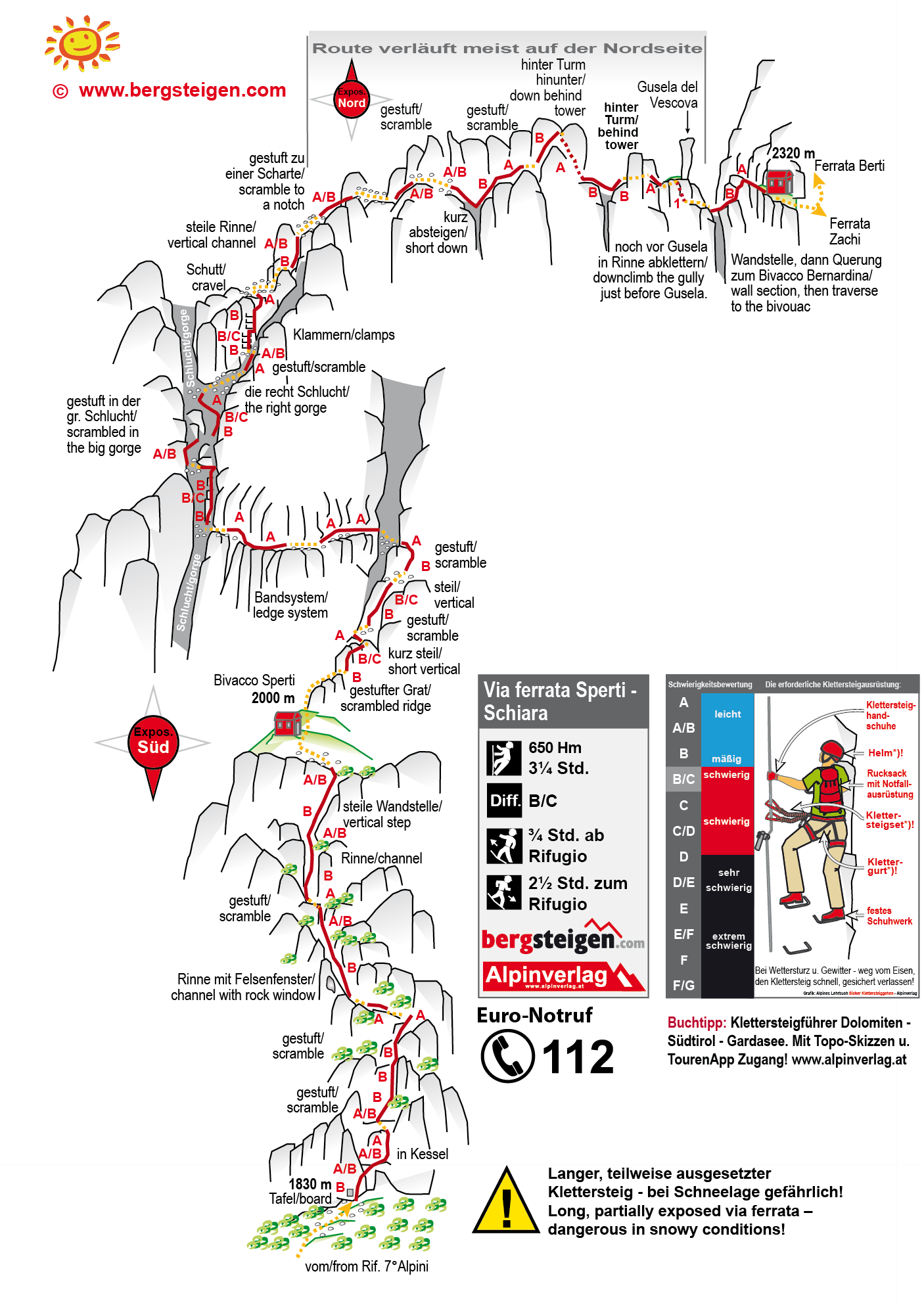 Route: Vom Einstieg über eine kurze Steilstufe (B) von links in einen Kessel und am rechten Rand steil höher (B). Über gestuftes Gelände (A/B) und eine mit einigen Türmchen bestückte Felsstufe aufwärts bis zum Gehgelände. Links erreicht man eine steile Rinne (B) und gelangt vorbei an einem Felsenfenster zu einem leichteren Abschnitt (A/B). Eine zweite Rinne (B) führt zur letzten Wandstelle (B) und zum Wiesenabsatz mit dem Bivacco Sperti (ca. 2000 m). Nach dem Biwak ungesichert über den Grat zu einer Steilstufe (B/C). Danach am rechten Rand einer Schlucht höher (B) und auf schönen, leichten Bändern (A) unter der Pala Belluna in die schon sichtbare linke Schlucht queren. In der Schlucht zuerst rechts, dann links höher (immer wieder Stufen bis B), bis man zum flachen Gelände (A) kommt. Dort in die rechte Schlucht (nicht gerade hinauf) und gestuft (kurz B/C) aufwärts zu den am linken Schluchtrand angebrachten Leitern. Über Stufen (kurz B/C) und Schrofen hinauf auf den Schuttabsatz. Dort rechts den Steigspuren in eine Rinne folgen, über die man steil (B, B/C, dann A/B) eine Art Scharte erreicht. Dann auf der Nordseite auf- und absteigend den Markierungen folgen (A und A/B), bis man nach einem steileren Anstieg (B) in eine Mulde (B) vor der Gusela del Vescova (Felsnadel) kommt. Von dort ist das Biwak schon zu sehen, man muss aber noch in eine Scharte absteigen (eine Rinne abklettern, 1) und auf der gegenüberliegenden Seite über eine Steilstufe (B) und ein Querband (A) zur Biwakschachtel (Bivacco della Bernardina) aufsteigen.