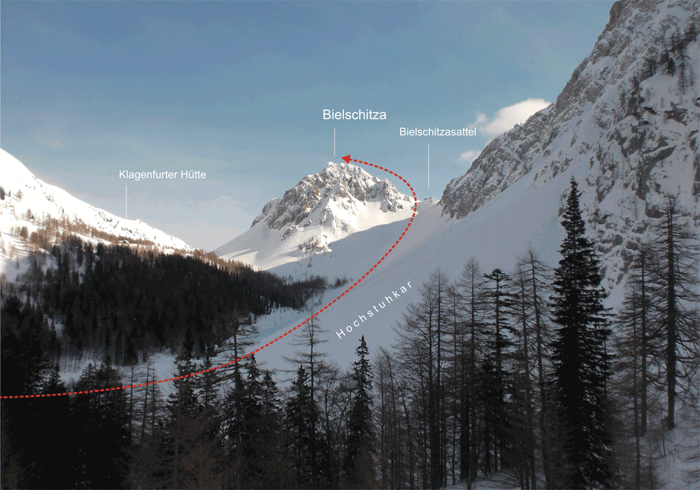 Vom Parkplatz ausgehend folgt man der Forststraße, vorbei an der Johannsenruhe, bis man zum offenen Hochstuhlkar gelangt. Hier biegt man in der "Karkehre" von der Straße ins offene Gelände ab. Immer leicht ansteigend quert man das Hochstuhlkar unter der Klagenfurter Spitze und der Edelweißspitze, bis man schließlich den Bielschitzasattel (1840m) über den steiler werdenden Hang erreicht. Je nach Schneebedingungen Skidepot machen oder noch weiter bis zum Vorgipfel. Dann über den Südgrat zum Gipfel.