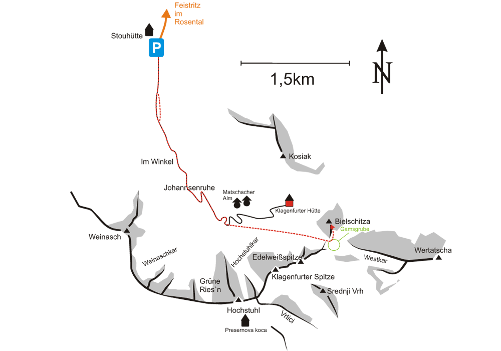 In Feistritz/ Rosental biegt man ins Bärental (Beschilderung). Über die auch im Winter geräumte Straße bis zum Winterparkplatz bei der Stouhütte (960m)
