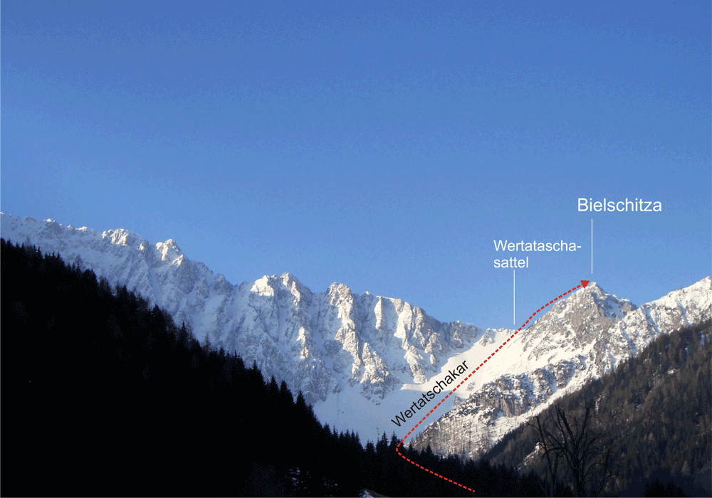 Vom Parkplatz des Bodenbauer über einen Forstweg bzw. über die Loipe in südlicher Richtung vorbei an der Märchenwiese, weiter ins offene Kar. Das Gelände steilt nun auf und man steigt das Kar zum Wertatscha-Sattel (1840m) auf. Dort befindet sich nun in die Gamsgrube. Je nach Schneeverhältnissen kann man noch ein Stück den Südhang der Bielschitza emporsteigen, bis man das Skidepot macht. Über den Grat gelangt man nun zum Gipfel. Steigeisen sind nicht zwingend nötig, aber von Vorteil.