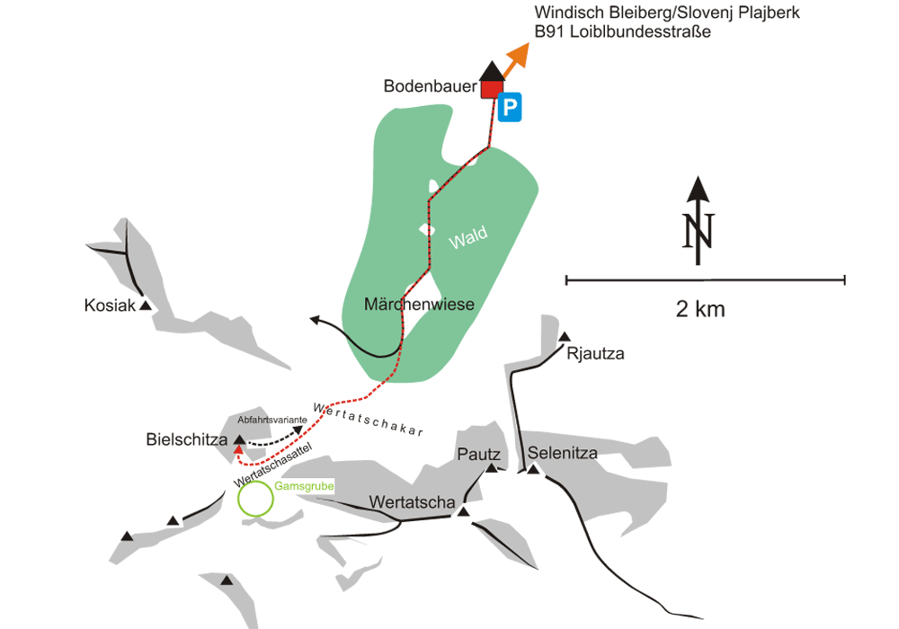Von Ferlach bzw. Trzic über die B 91 Loibler Bundesstraße zum Kleinen Loiblpass, rechts weiter nach Windisch-Bleiberg und von dort ins Bodental bis zum Bodenbauer. Dort parken.