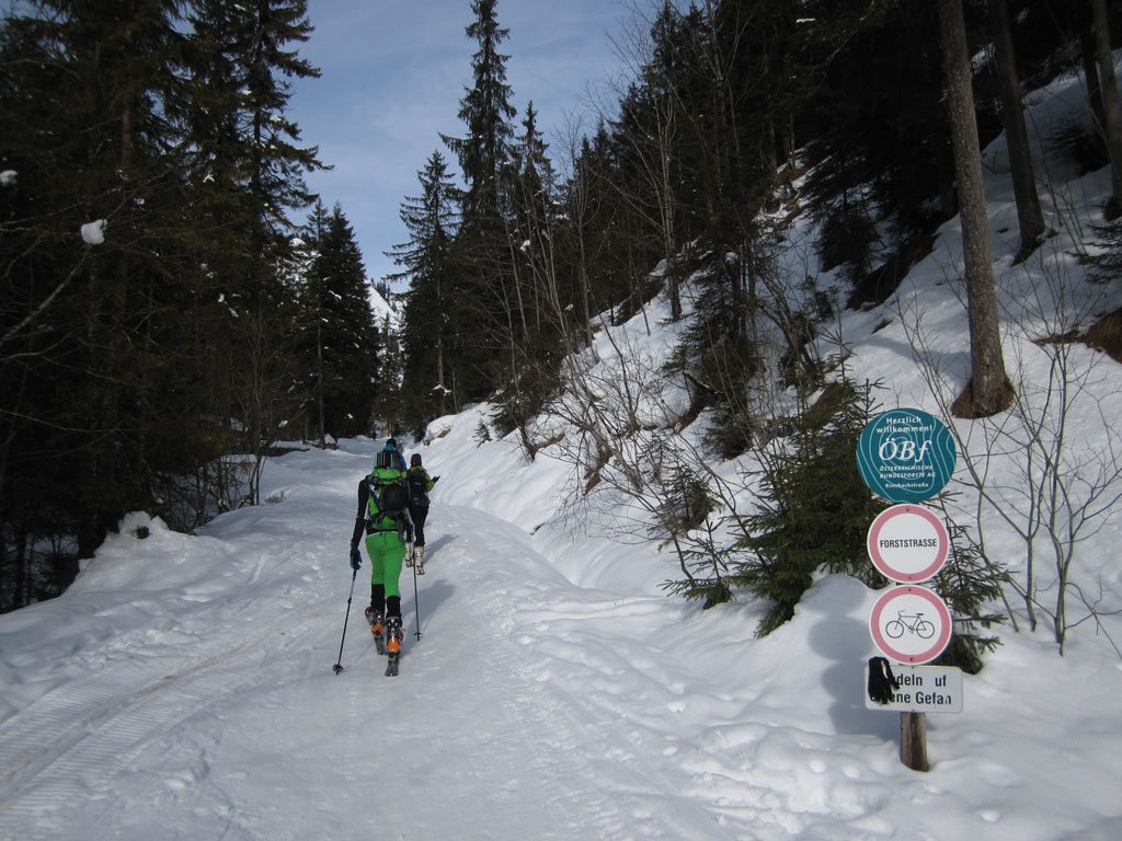 Abfahrt wie Aufstieg. Ab der Angerkaralm ist bei guten Schneeverhältnissen statt des flachen Fahrwegs der Graben direkt ins Rinnbachtal vorzuziehen.