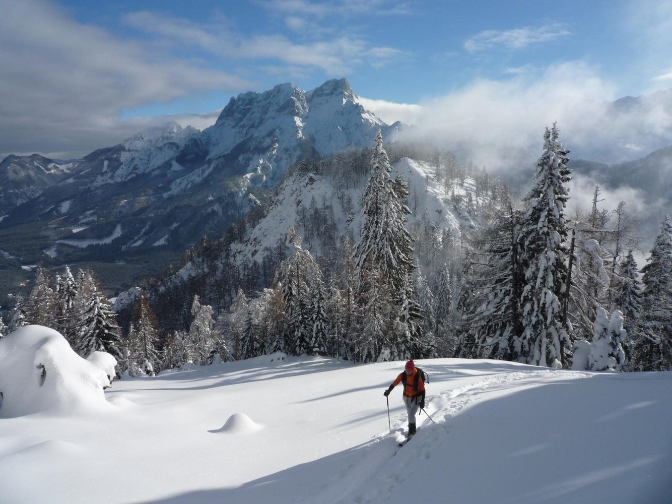 Schöner, weniger bekannter Aufstieg auf den Grabnerstein durch das sogenannte Himmelreich. Insbesondere die Abfahrt ist hier, entsprechende Verhältnisse vorausgesetzt, lohnender als über die Grabneralm. Man kann diesen Aufstieg aber auch mit der Abfahrt über die Grabneralm bzw. umgekehrt kombinieren.