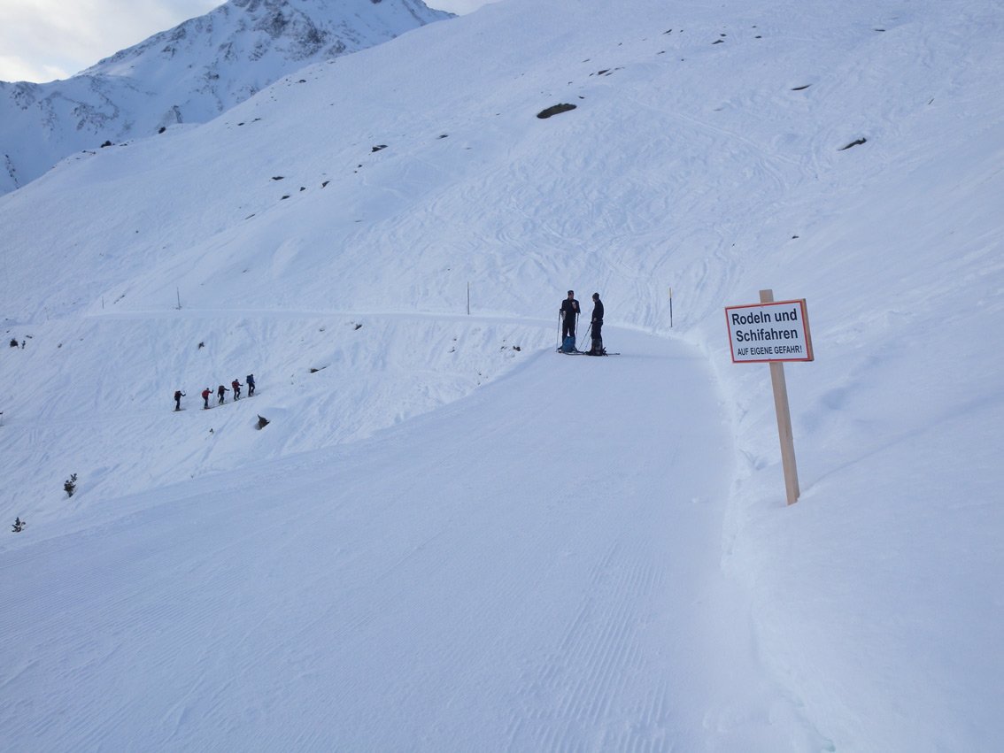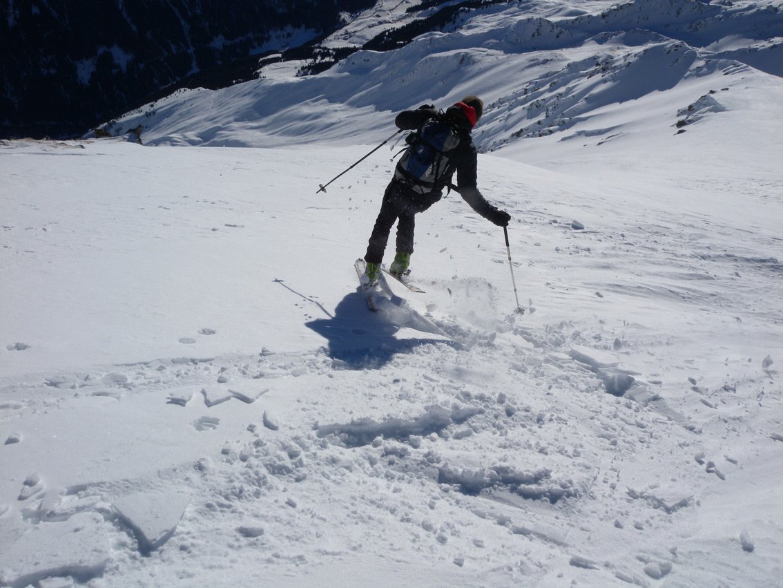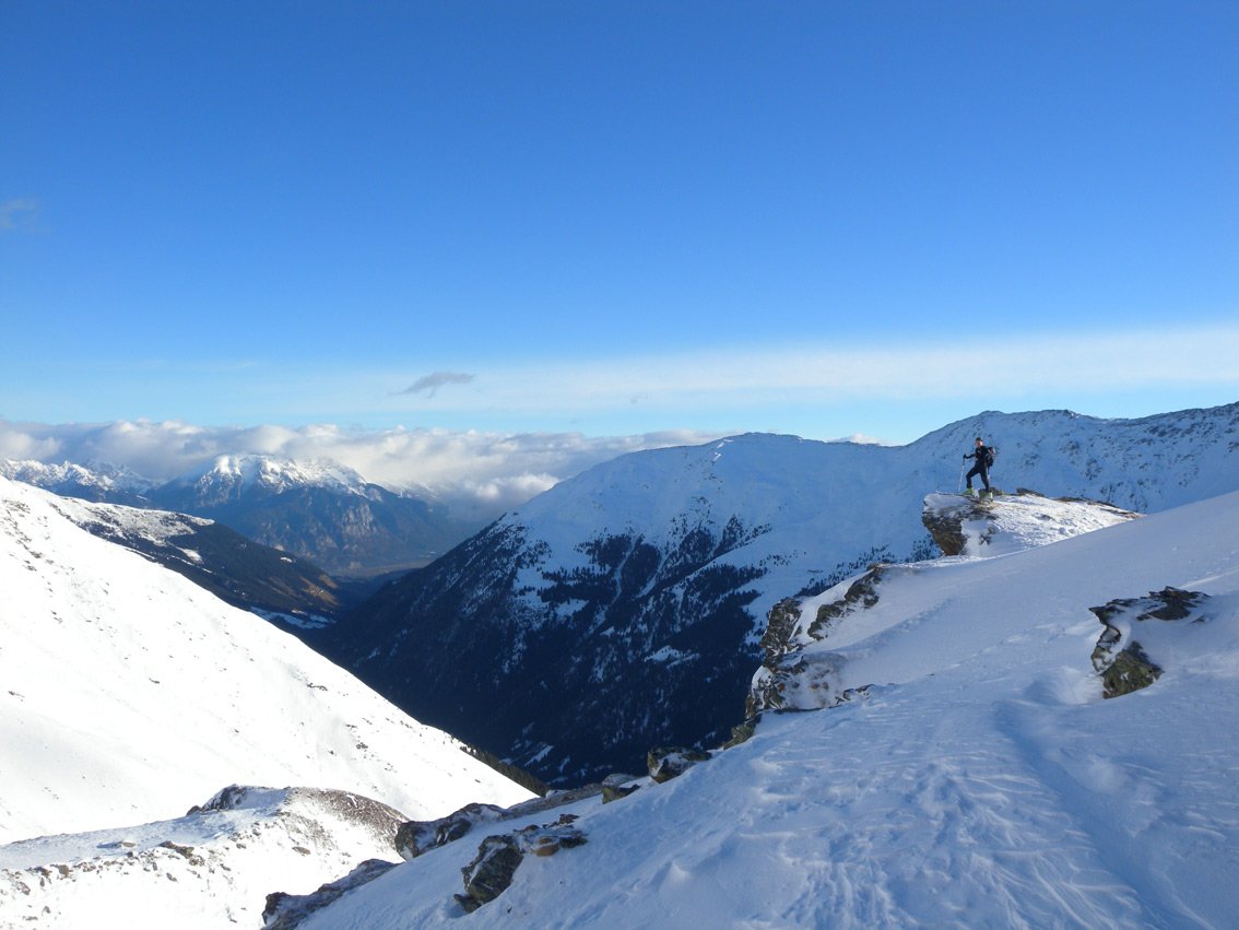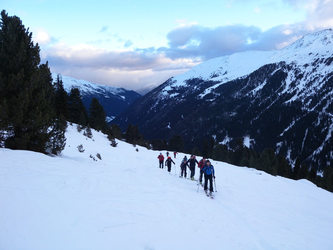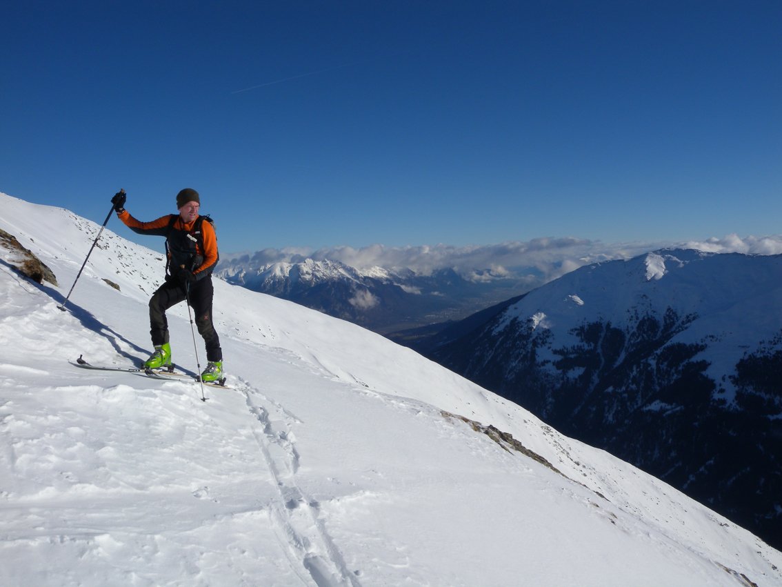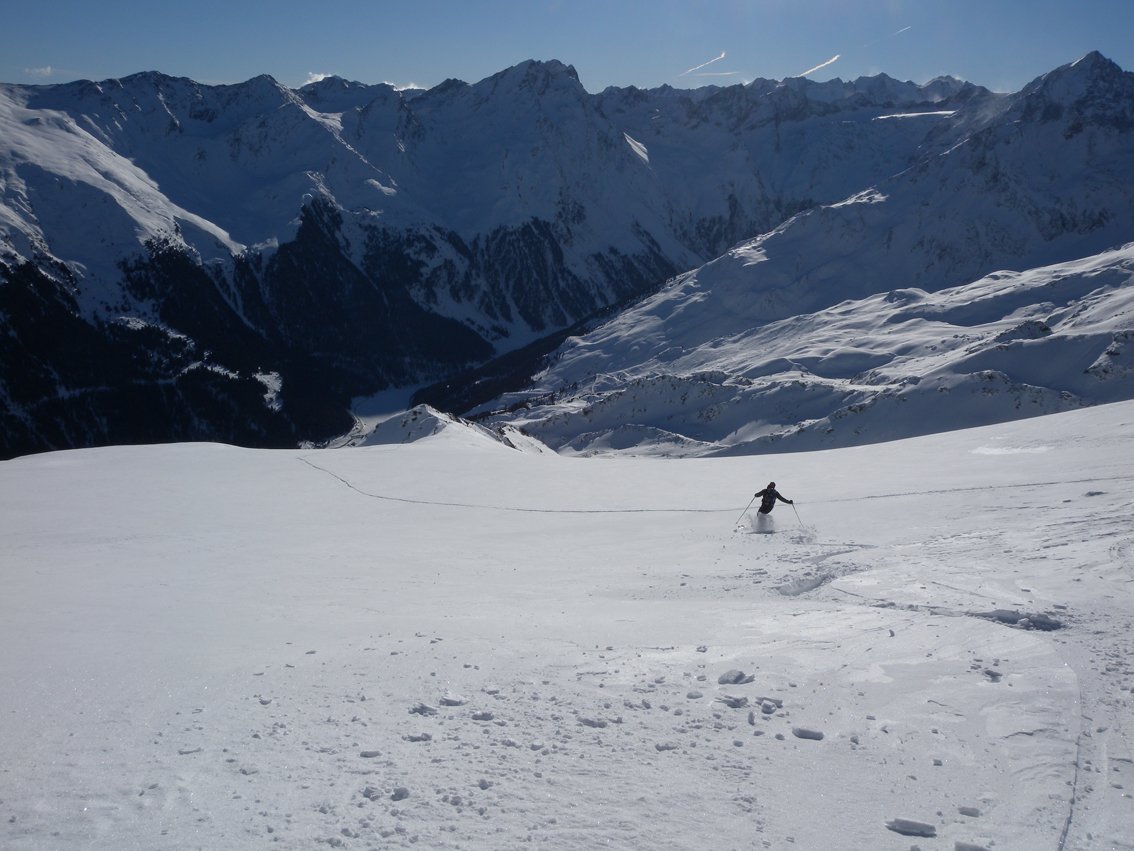 Abfahrt im Bereich der Aufstiegsspur. Alternativ kann man im Kühgrübl bzw. schon direkt vom Gipfel nach Praxmar abfahren. Auf ca. 2000 m nach rechts um den Rücken herum zum Ort.