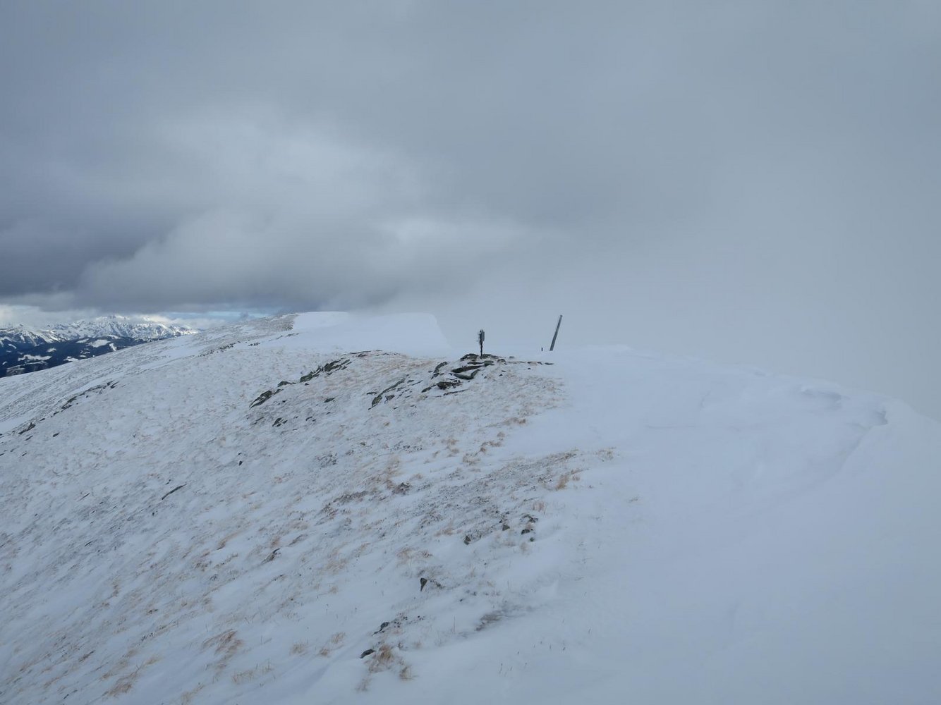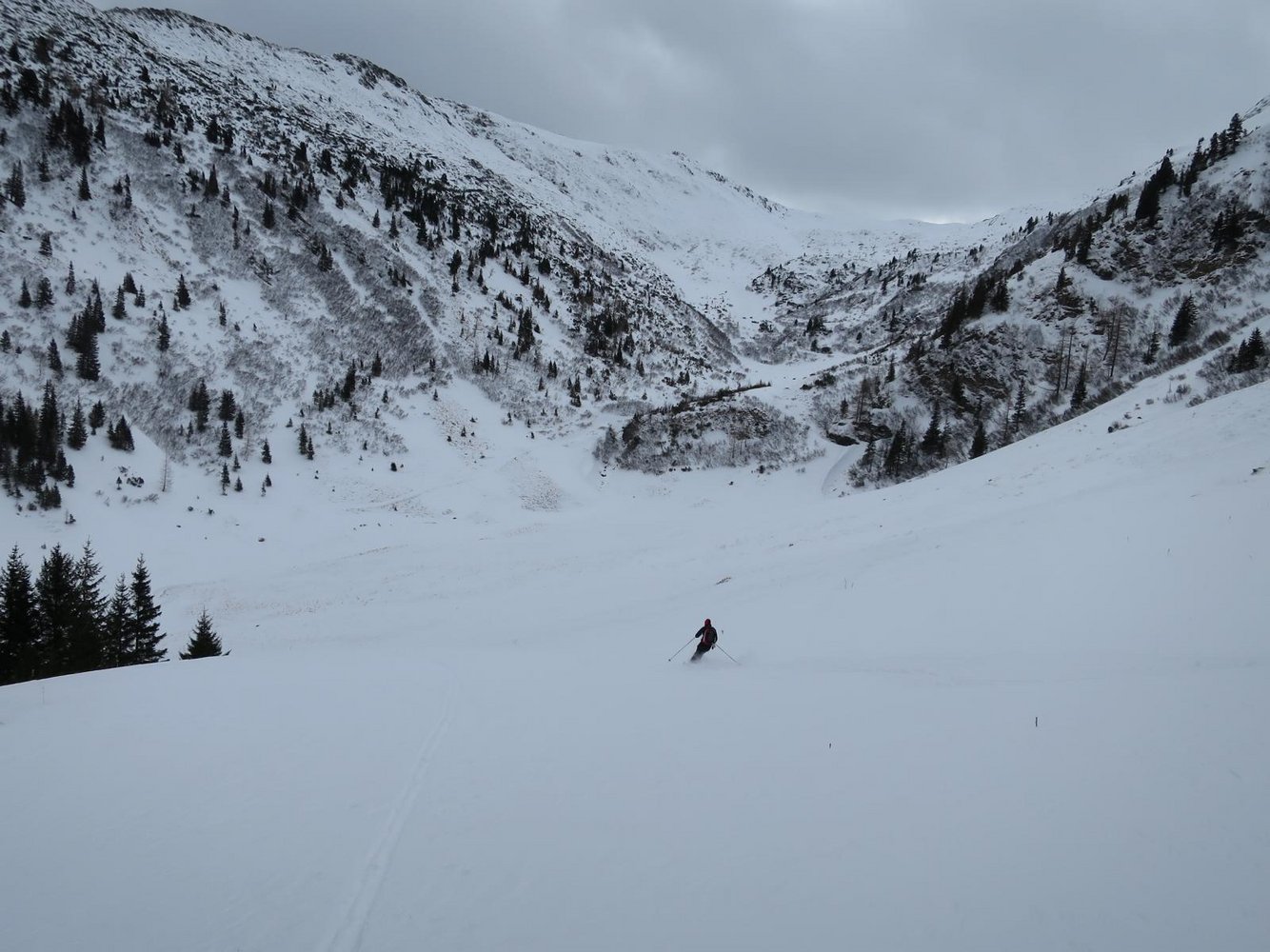 Abfahrt wie Aufstieg oder vom Gipfel direkt in den steilen Südhang einfahren (sehr hohe Lawinengefahr, dh. nur bei sichersten Verhältnissen).