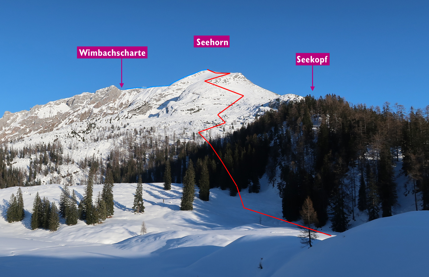 Vom Parkplatz im Hintertal (980 m) in Richtung südosten auf dem Forstweg zu einer Wiese unterhalb des Farmauriedels, dort zweigt die Spur links zum Seehorn ab. Man steigt unterhalb des Seekopfes auf und gelangt auf hügeligem Gelände zu einer kurzen Steilstufe. Nach dieser auf dem breiten Rücken zum schon sichtbaren Gipfelkreuz (abfellen). Man fährt auf dem Grat der sog. Kematenschneid ab, über einen Hügel hinüber (alles ohne Felle gut machbar) bis man zur Wimbachscharte gelangt. Dort beginnt die Abfahrt in den Loferer Seilgraben - in der Mitte ist dieser sehr steil! Am Ende des Grabens durch eine Engstelle in das breite Wimbachgries, dort aber schon rechts halten und später auffellen. Durch Latschen bis zur Wimbachgrieshütte (1327 m) und dort dann rechts auf dem markierten Sommerweg zu einer Steilstufe mit Felsband (direkt vor dem Felsband ist ein steiler Hang!). Nach dem Felsband (Holzbrücke) gelangt man in lichten Wald und erreicht die Trischübelalm (Wetterstation). Dort dann rechts in einer Art Rinne aufwärts und am Ende sehr steil (!) hinauf zu einem Sattel unterhalb des Graskopfes. Von dort rechtshaltend in der Hundstodgrube zum Hundstodgatterl (links von den Felsabbrüchen des Hundstods) aufsteigen. Dann etwas abwärts, je nach Schneesituation unterhalb des Hundstodfelsens nach rechts (je weiter oben, desto steiler ist diese Querung - ganz unten kann man auf einem nicht so steilen Rücken aufsteigen). Man kommt an eine Kante, links sieht man die Kuppe des Kleinen Hundstod (dort wäre auch die Möglichkeit auf den Großen Hundstod zu steigen - ist aber extrem steiles Gelände). Man hält sich unterhalb der Felsen und quert zum Dießbacheck (abfellen). Dann fährt man den wohl besten Hang der Tour hinunter auf die flache Hochwies (auffellen). Man steigt recht zentral hinauf zur Kematenschneid (oben steiler) und trifft dort wieder auf die bekannte Spur. Auf dieser nach links hinauf auf das Seehorn. Abfahrt auf der Aufstiegsspur hinunter zum Parkplatz im Hintertal.