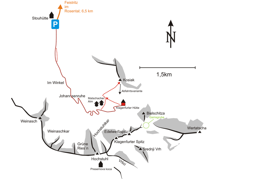 In Feistritz/ Rosental biegt man ins Bärental (Beschilderung). Über die auch im Winter geräumte Straße bis zum Winterparkplatz bei der Stouhütte (960m)