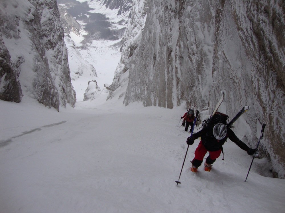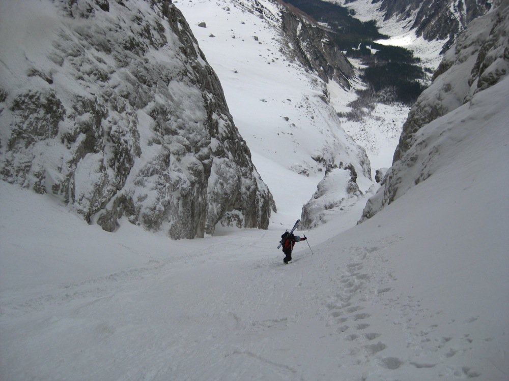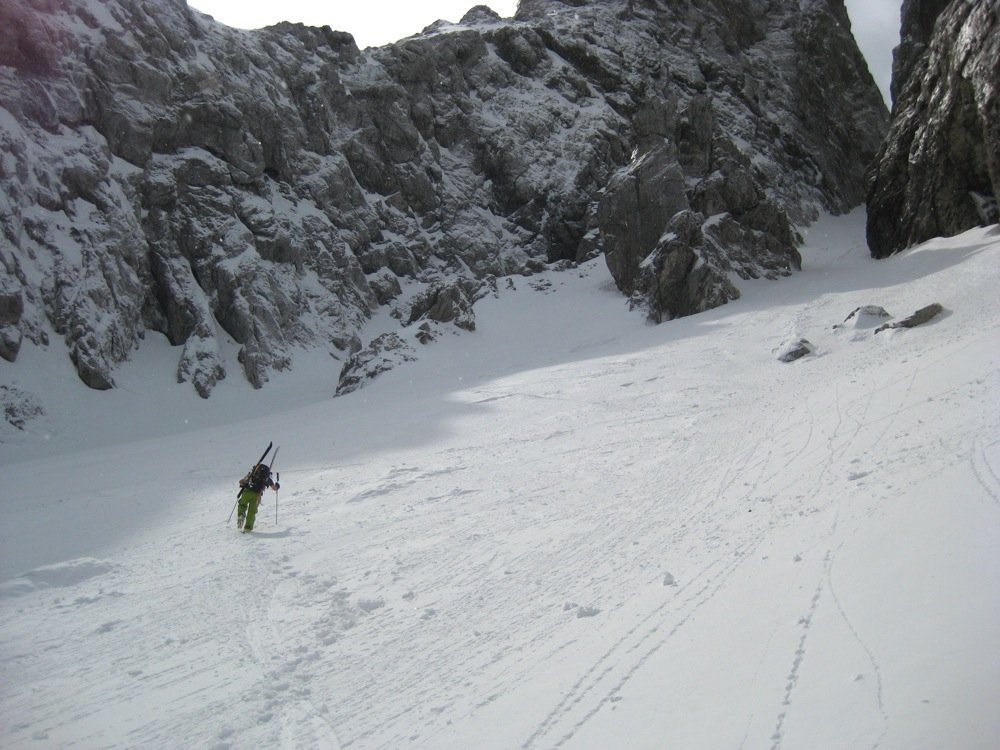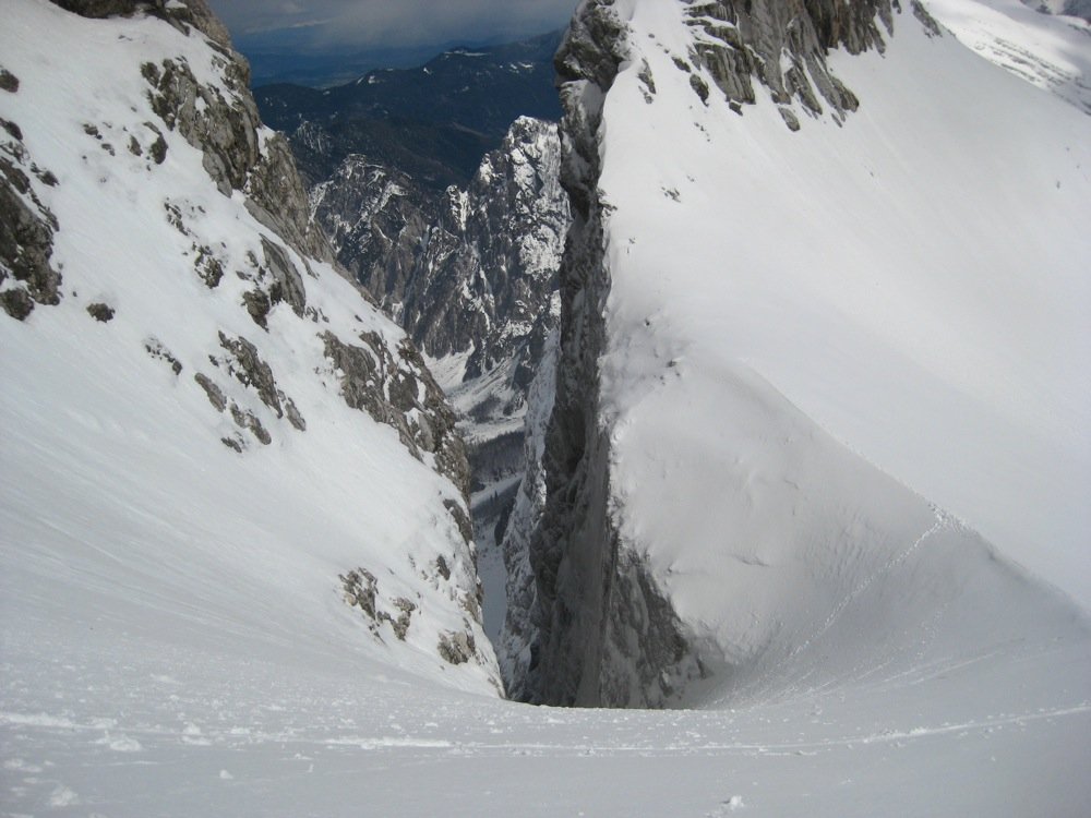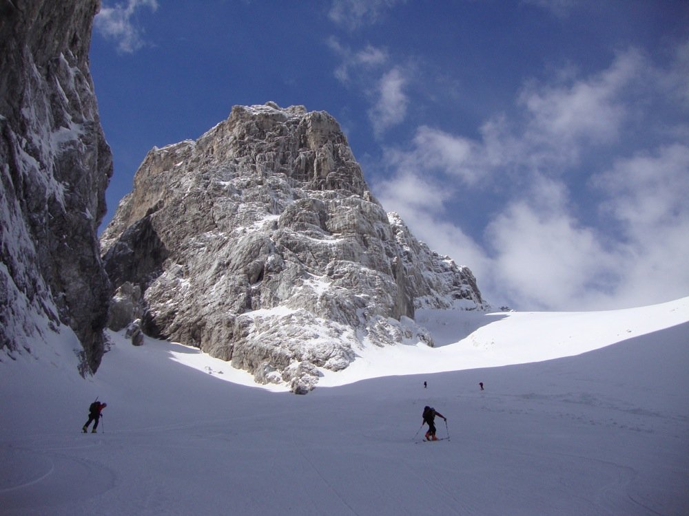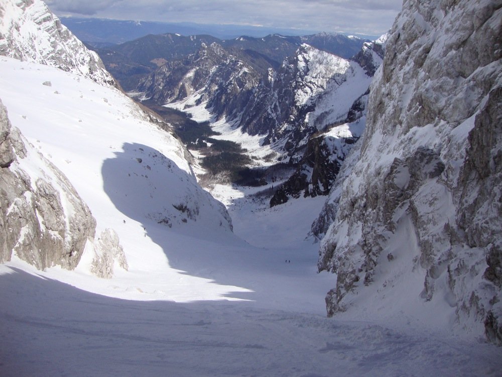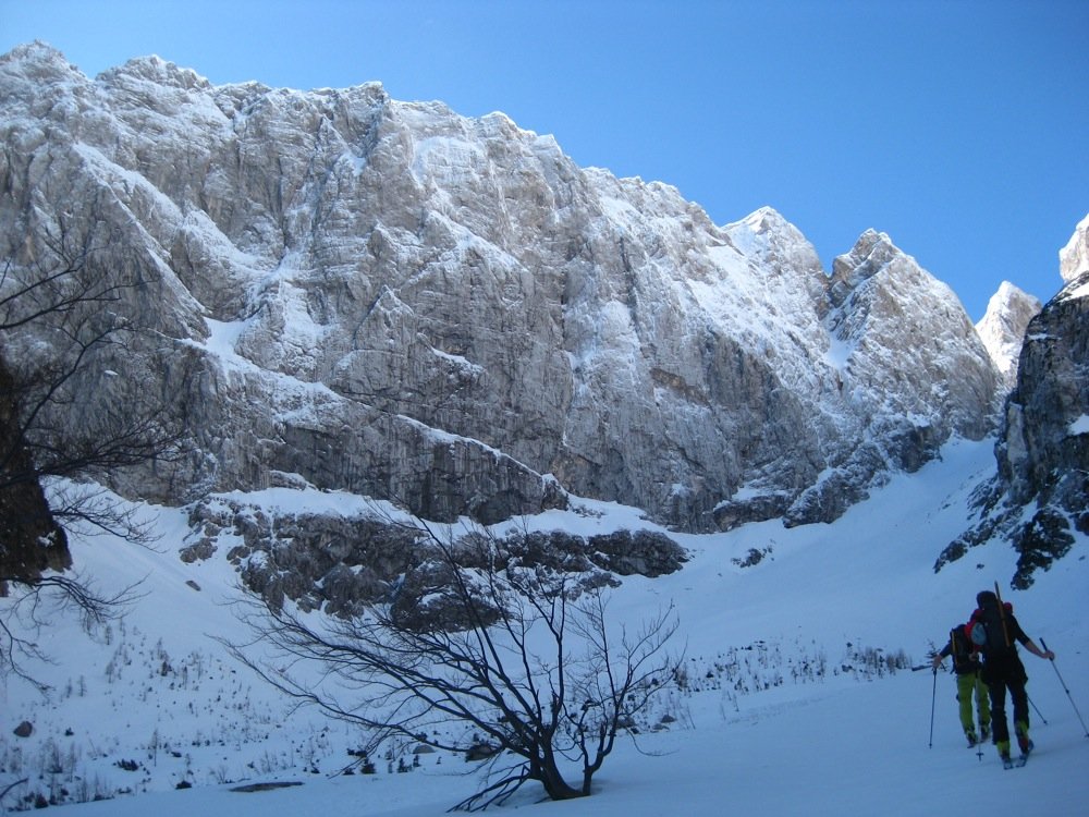 Der Jalovec ist mit Sicherheit der formschönste Berg der gesamten Julischen Alpen und nicht umsonst Wahrzeichen vieler slowenischer Bergsteigerverbände. Somit verwundert es nicht, dass die Skitour zu den „ganz Großen“ der Region zählt. Es handelt sich um eine sehr schöne Ganztagstour, die als reine Skitour (1200 Hm) oder als kombinierte Tour bis zum Gipfel des Jalovec (1650 Hm) gemacht werden kann. Nur in ganz ganz seltenen und schneereichen Wintern kann man sogar vom Gipfel abfahren. Der Aufstieg und die Abfahrt erfolgen über das berühmte und schon von Weitem sichtbare Kugy-Couloir.