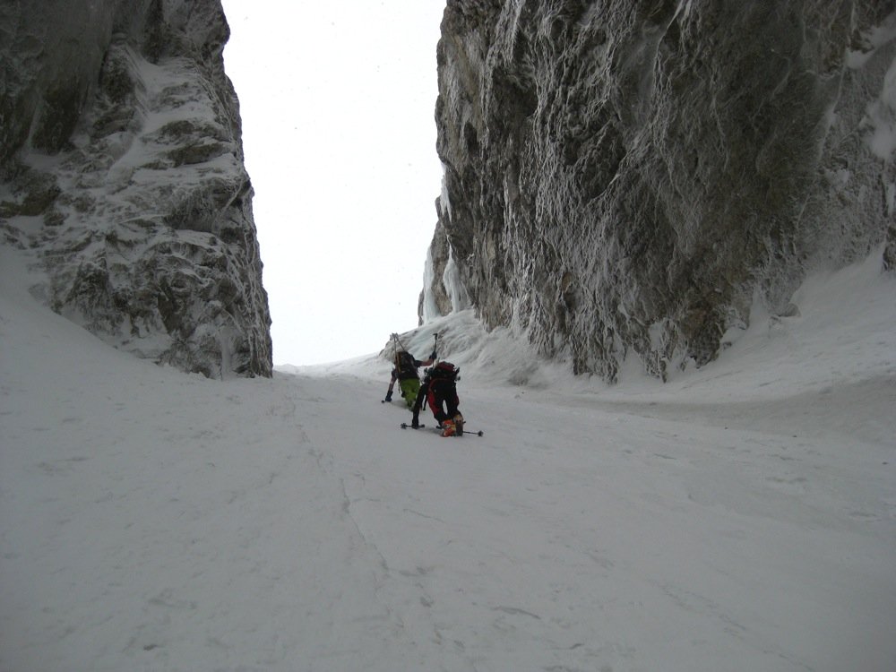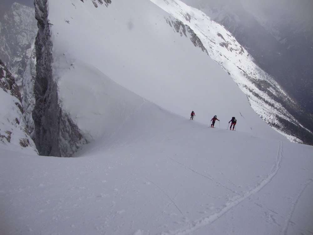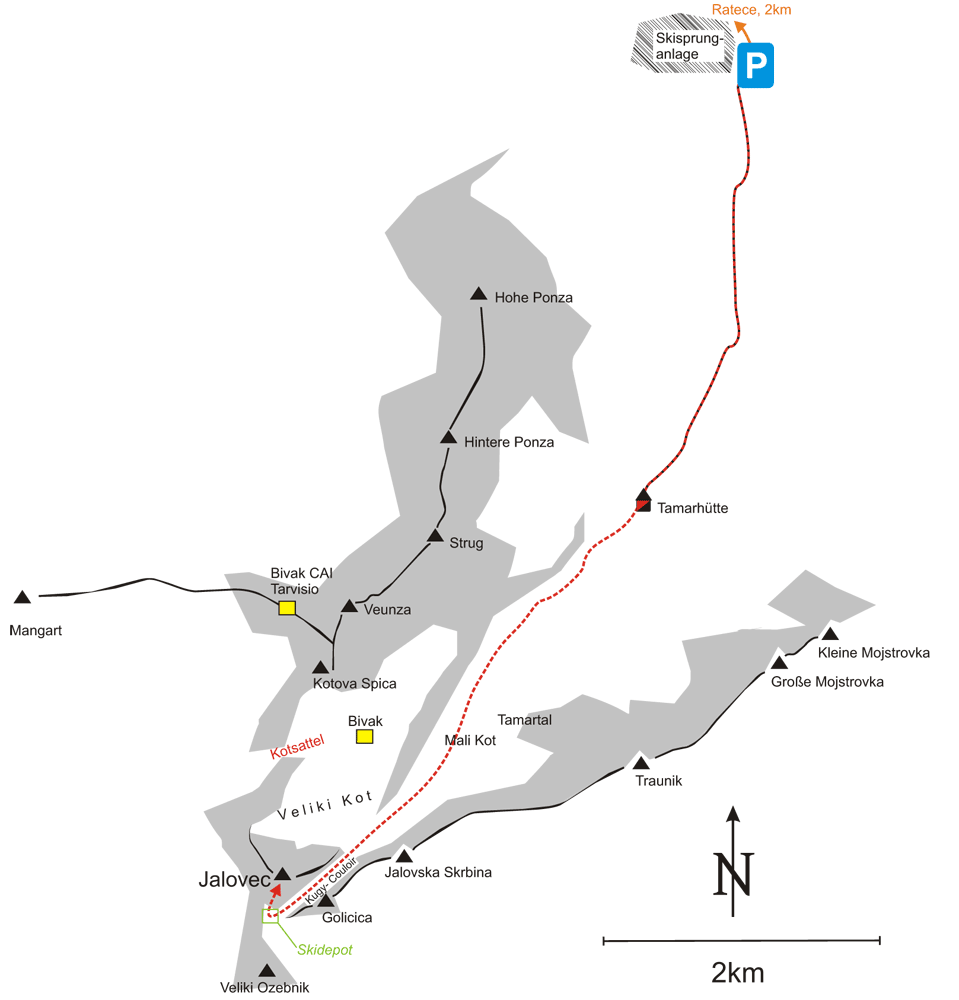 Vom Parkplatz bei den Skisprungschanzen folgt man der präparierten Rodelbahn/ Langlaufspur taleinwärts ca. 1 Stunde, bis man die Tamarhütte (Dom v Tamarju) erreicht. Rechts hinter der Hütte beginnt ein Weg, der durch einen im Winter lichten Laubwald rechts entlang des Tals führt, bis man schließlich auf offenes Gelände stößt. Der weitere Weg führt über weites, baumfreies Gelände eindeutig in Richtung des schon die meiste Zeit sichtbaren Couloirs. Im Couloir selbst trägt man die Skier am besten, auch ein Helm ist ratsam, da vom sogenannten Jalovec-Dach oft Steine herabfallen. Am Ausstieg wird man bei gutem Wetter mit den ersten Sonnenstrahlen belohnt und die letzten 100 Höhenmeter bis zum Skidepot können in Angriff genommen werden. Hier endet die als reine Skitour bezeichnete Variante. Wer den Gipfel machen will, steigt nun über die Südseite zum Gipfel auf. Achtung: Steigeisen sind in beiden Fällen ein Muß, für den Gipfelsturm auch ein Pickel bzw. ein kurzes Seil ratsam.