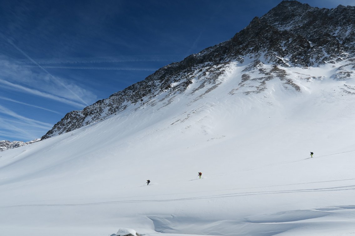 Auf dem Längentalferner hält man sich eher östlich, um eine Spaltenzone unterhalb des Bachfallenkopfes zu meiden.