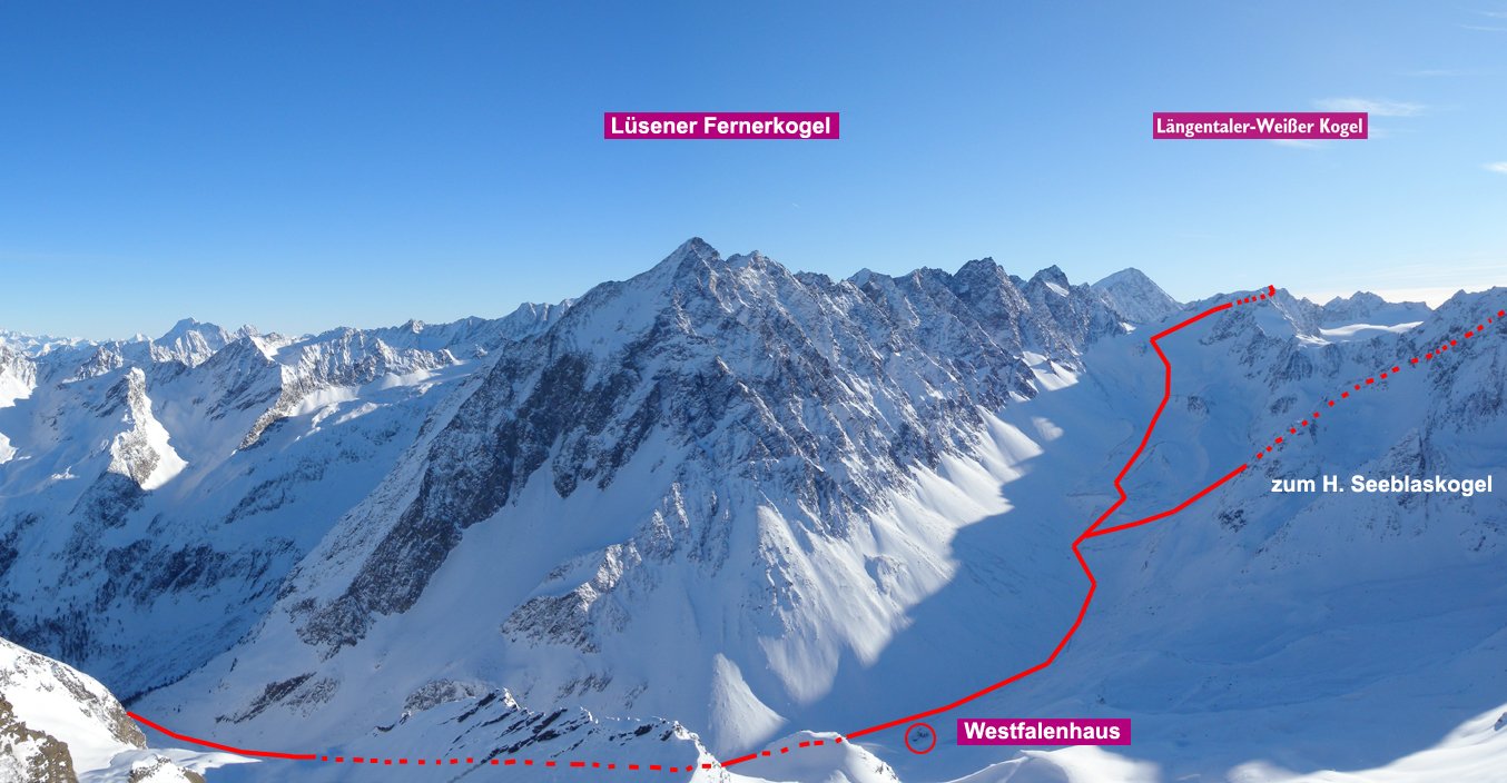 Vom großen Parkplatz beim Gasthof Lüsens entlang der Langlaufloipe taleinwärts zum Fernerboden, dort vorbei an einer Hütte in Richtung Westen in das Längental aufsteigen (unterhalb der Materialseilbahn des Westfalenhauses). Im Tal flach weiter, an der Längentalalm vorbei in Richtung Westfalenhaus, unterhalb des Schutzhauses nach links im immer noch flachen Tal weiter. Rechts zweigt der Aufstieg zum Hohen Seeblaskogel ab und man erreicht steileres Gelände. In Talmitte über die Gletschermoräne hinauf zu den Resten des Längentalferners. Dort hält man sich links in Richtung Längentaljoch, unterhalb des Joches nach rechts, wieder flacher, zum Gipfelhang. Der Gipfelhang wird über rechts angegangen, man steigt in Kehren zum Kamm hinauf und quert dort links zu den Gipfelfelsen. Dort ist das Skidepot, die letzten paar Meter steigt man zu Fuß zum Gipfelkreuz auf.