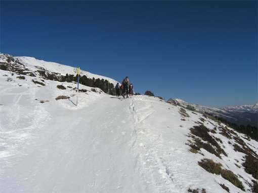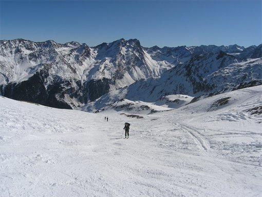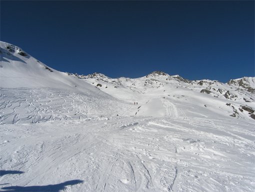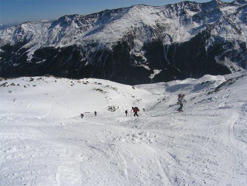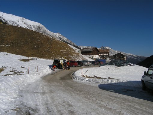 Vom Parkplatz rechts zum Schlepplift hinauf und rechts von diesem über die Piste, dann über einen Ziehweg zur Rodelbahn hinauf - dieser folgt man bis auf ca. 2200m (die Rodelbahn kann auch abgekürzt werden, meist sind eine oder mehrere Spuren vorhanden). Dann im freien Gelände leicht linkshaltend zu einer Art Graben, dieser führt über ein paar steilere Stufen zum Satteljoch (2753 m), dort ist in der Regel das Skidepot. Vom Joch rechts über den meist abgeblasenen Grat zum Gipfel.