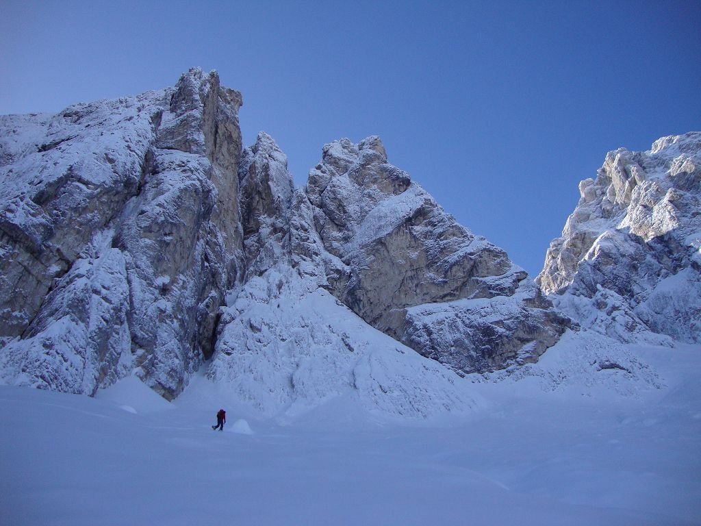 Vom Parkplatz in Riofreddo (833m) auf der Forststraße entlang des Bachs ins Kaltwassertal. Nach ca. 5 Kilometern wird die Forststraße steiler und schlängelt sich in Kehren hinauf zum Sella Prasnig (1491). In einer markanten Kehre auf ca. 1325m (unter den Cime delle Rondini) zweigt man auf den Sommerweg (Nr. 618) ab und zieht dem Geländeverlauf folgend in das offene Kar „Carnizza di Riofreddo“. Nun immer weiter hinauf bis sich das Kar zu einer Rinne verengt. Hier macht man das Skidepot, je nach Schneeverhältnissen kann man auch über den dunklen Schlund zur Scharte hochklettern (Steigeisen/Pickel! Im Sommer kurzer versicherter Klettersteig mit Leitern).