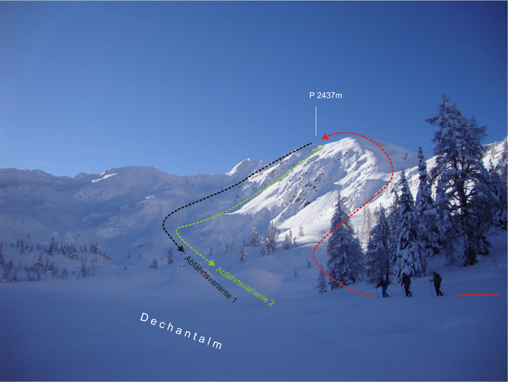 Abfahrt wie Aufstieg bzw. Abfahrtsvarianten. Abfahrtsvariante 1: Die leichtere Variante führt vom Gipfel in südlicher Richtung in einen Karboden und anschließend in nördlicher Richtung weiter zurück zur Dechantalm. Abfahrtsvariante 2: Kurz vor dem Punkt 2437 über den Osthang, der in der Mitte schmäler wird, ehe er sich wieder weitet.