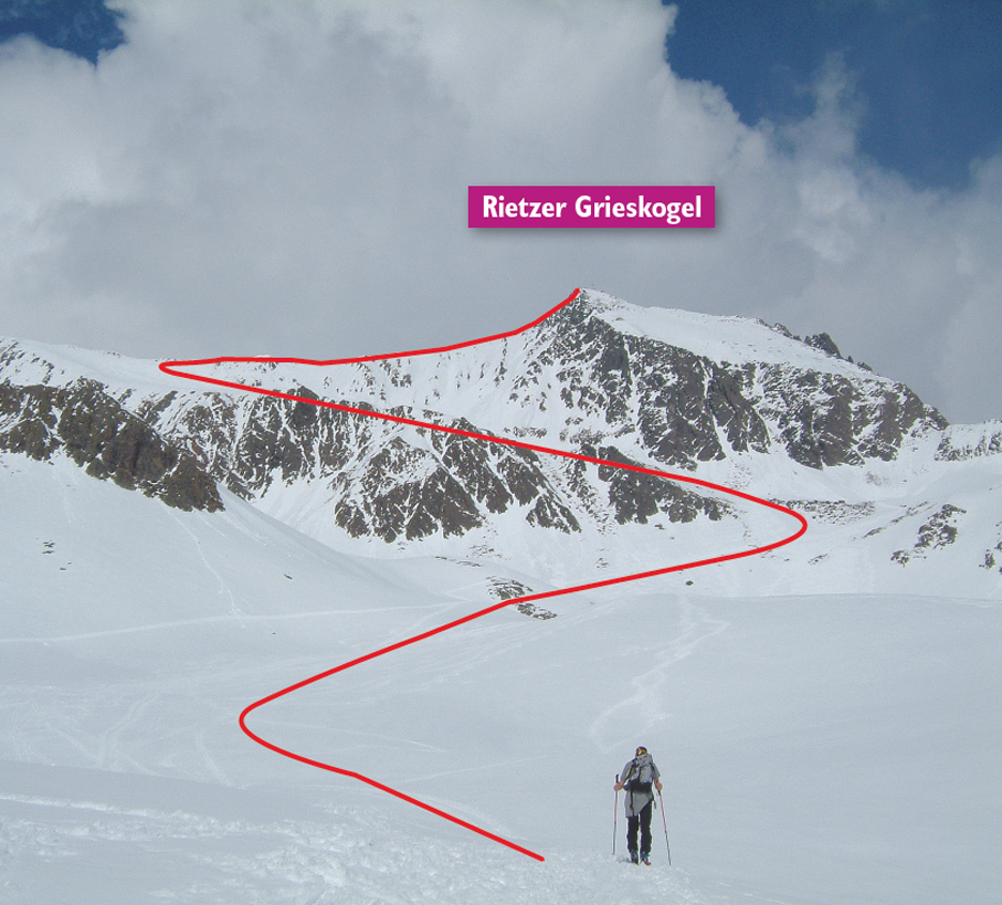 Der Rietzer Grieskogel ist einer der Klassiker im Kühtai, selten ist man alleine unterwegs. Bis auf den kurzen Steilhang nach den Narrenböden und dem rechts und links steil abfallenden, aber breiten Gipfelgrat ist die Tour leicht. Schöne Abfahrtshänge und ein schöner Gipfelgrat sorgen für Abwechslung. Toller Blick vom Gipfel hinunter nach Telfs und die Mieminger-Kette. Wer den Gifelgrat nicht machen will (bei Schneemangel oder wegen Überwechtung) lässt es in der Scharte gut sein.