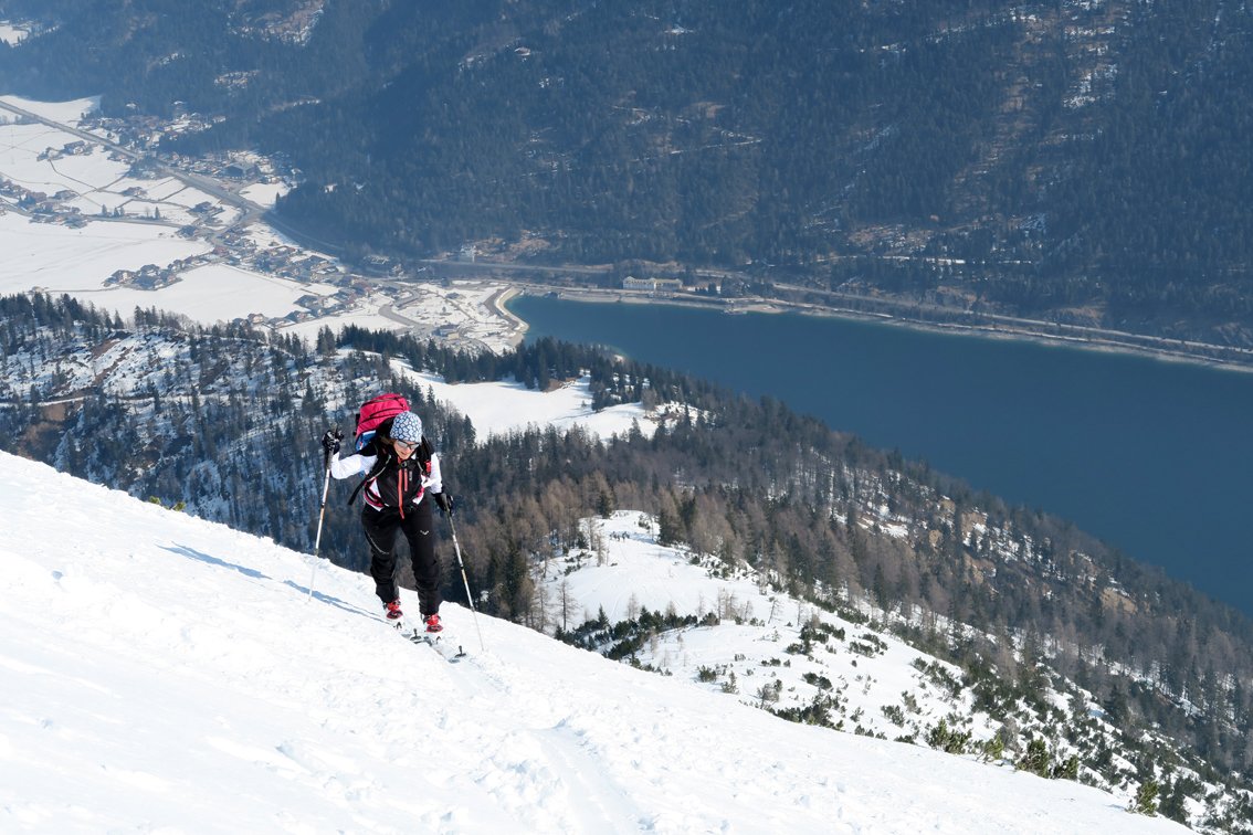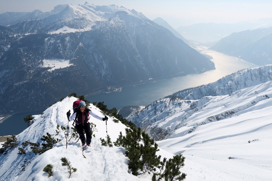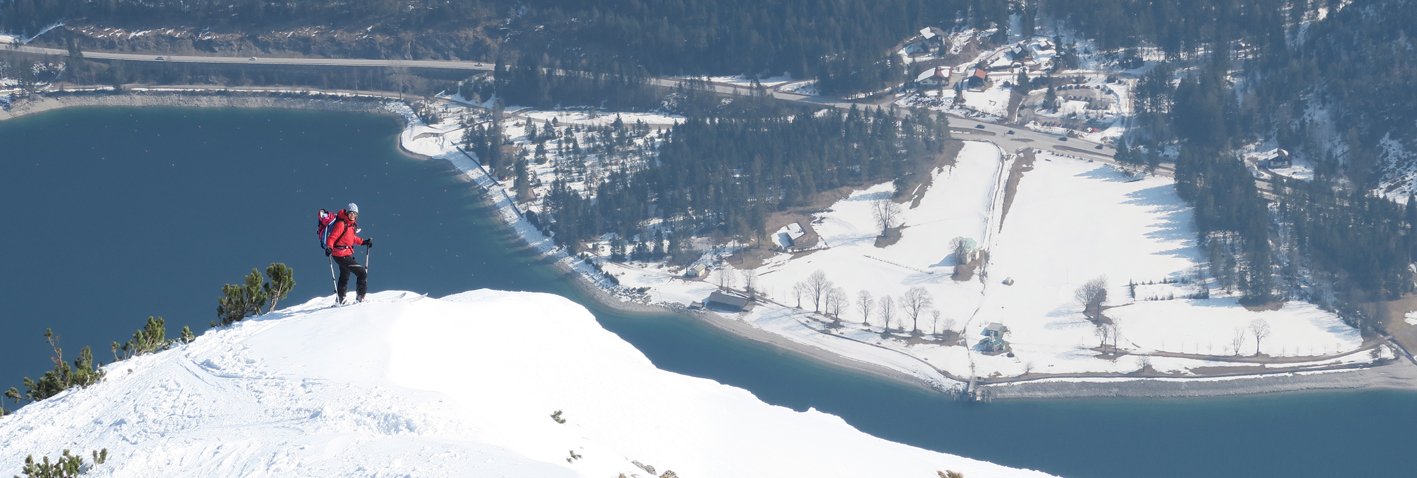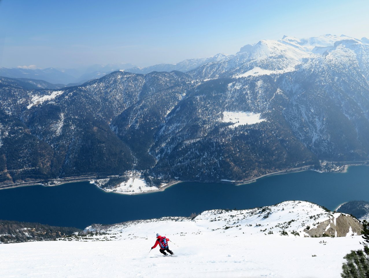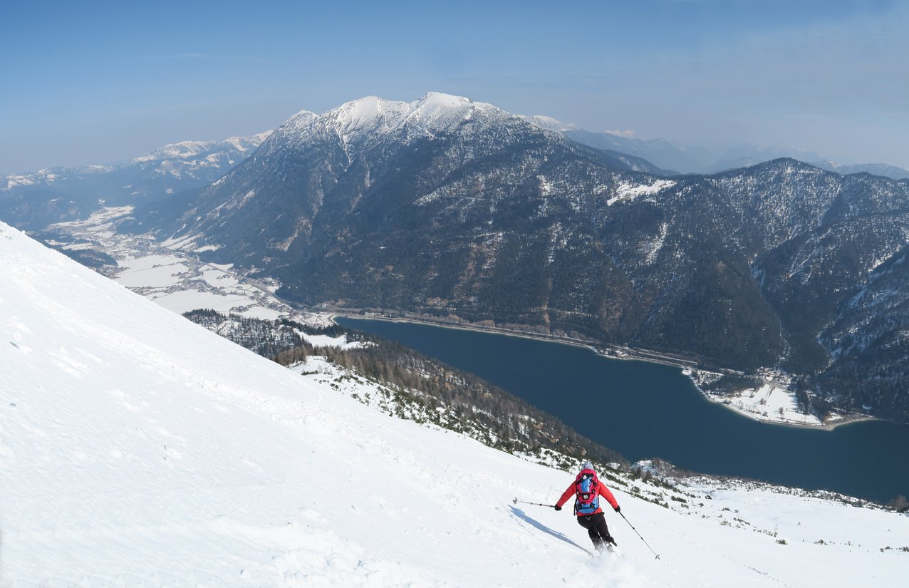 Seeblick par excellence - anders kann man den Aufstieg zur Seekarspitze gar nicht beschreiben. Im steilen Gelände seine Spitzkehren machen und den ganzen Achensee überblicken, was will man mehr! Die Tour gehört sicher zu den besten Skitouren am Achensee und hat oben noch ein schönes, nicht allzu schweres Kraxelfinale. Die letzten Meter geht man auf auf dem flachen Kamm zum mächtigen Gipfelkreuz. Bei der Abfahrt an der Ostflanke, direkt auf den blauen Achensee zu, fühlt man sich fast wie in Norwegen!