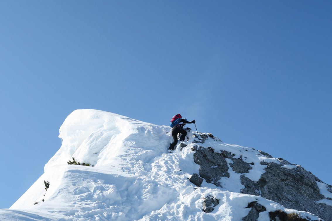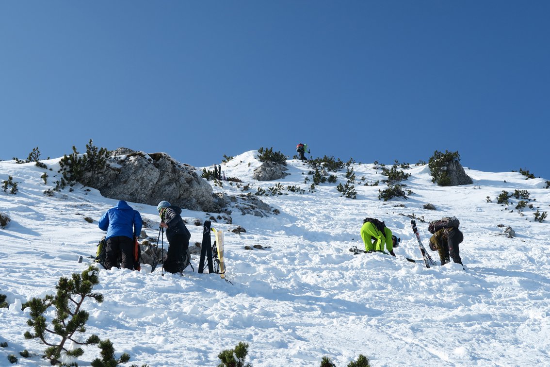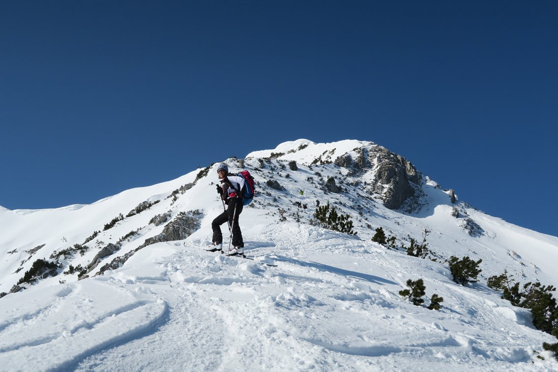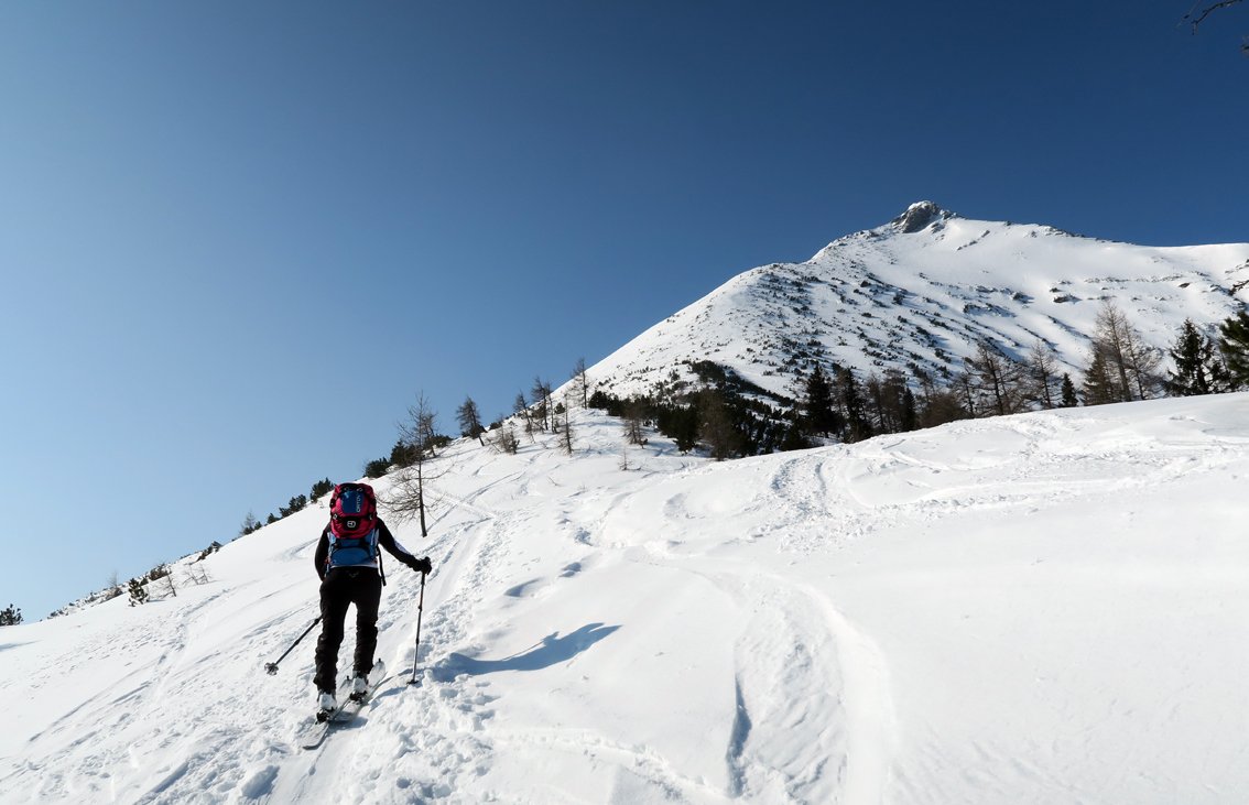 Wegen der steilen Hänge im oberen Teil der Tour sind sichere Schneeverhältnisse nötig. Wenn der Gipfelgrat vereist ist, könnten Steigeisen von Vorteil sein - Harscheisen sollte man auf jeden Fall dabei haben!