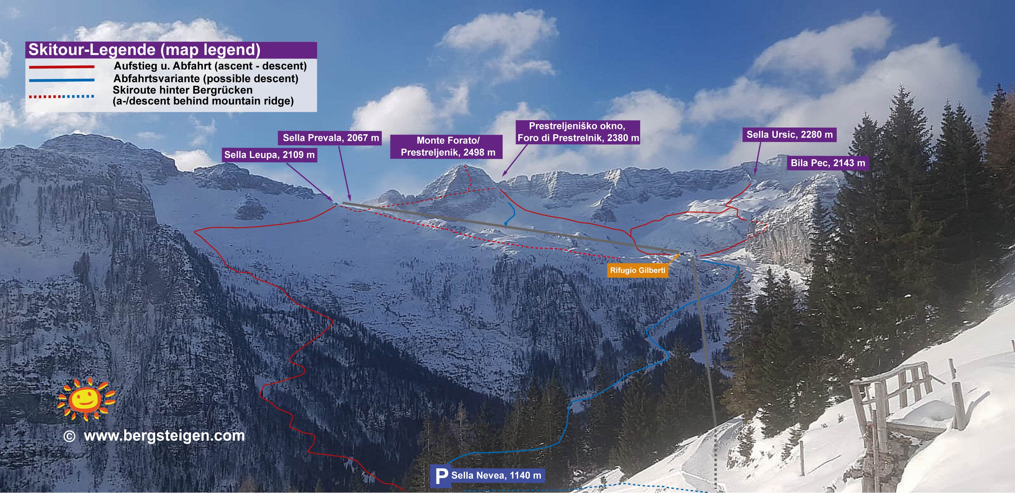 AUFSTIEG // Vom Parkplatz über die Skipiste zum Rifugio Gilberti. Im Bereich des Bila Pec, dem ausgezeichneten Kletterberg, sollte man den Sommerweg nahe der Felswand nehmen, da die Piste zu steil ist. Im Hochwinter kann man bis zum Rifugio alternativ auch mit der Gondelbahn fahren. Hinter der Hütte quert man etwa 300 Meter in südöstlicher Richtung und steigt die kurze Rinne auf. Nun folgt man dem gleichmäßigen Verlauf der Schneemulde in südwestlicher Richtung. Der Weiterweg ist ab etwa 2100 Metern etwas kupierter, die Richtung bleibt aber immer gleich. Schließlich erreicht man den Sattel, wo man mit einem genialen Ausblick belohnt wird!