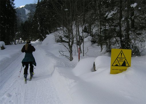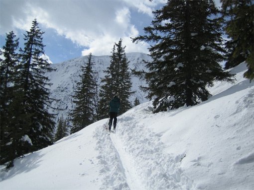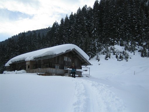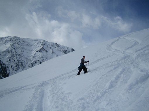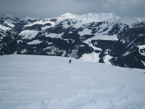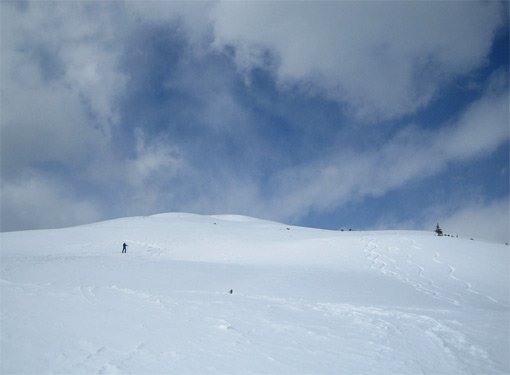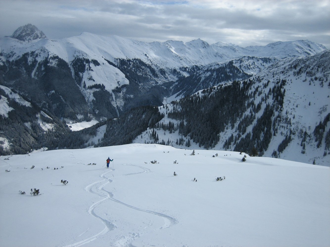 Nordostseitige Schitour über einen relativ lawinensicheren Rücken und ausgedehnte Almwiesen.