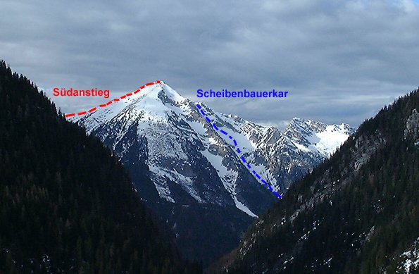 Alternativ kann man natürlich auch den Südanstieg von Gstatterboden über die Ennstaler Hütte machen. Hier muss man allerdings unangenehm (2. Grad)den Nordostgrat ins Scheibenbauernkar abklettern und sehr steil (Schwierigkeit 4) ins Kar einfahren.