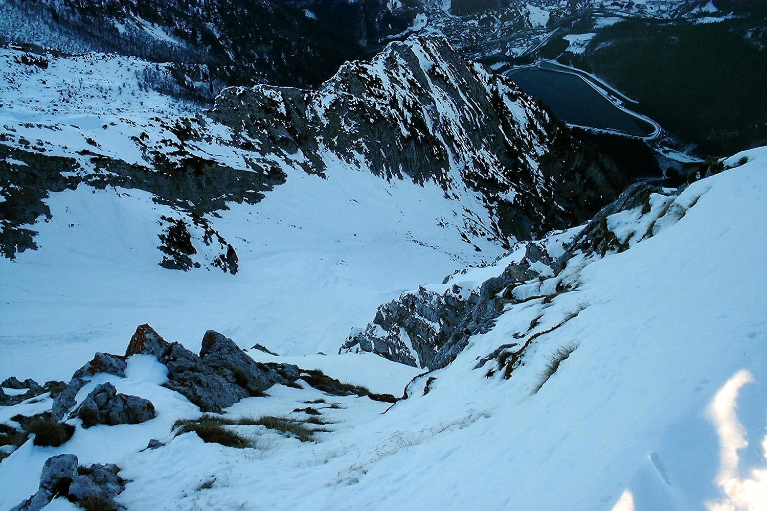 Imposantes Kar das knapp neben dem Hauptgifpel bis hinunter nach Hieflau zieht. Nur im Frühjahr oder bei 100% sicheren Lawinenverhältnissen befahren!