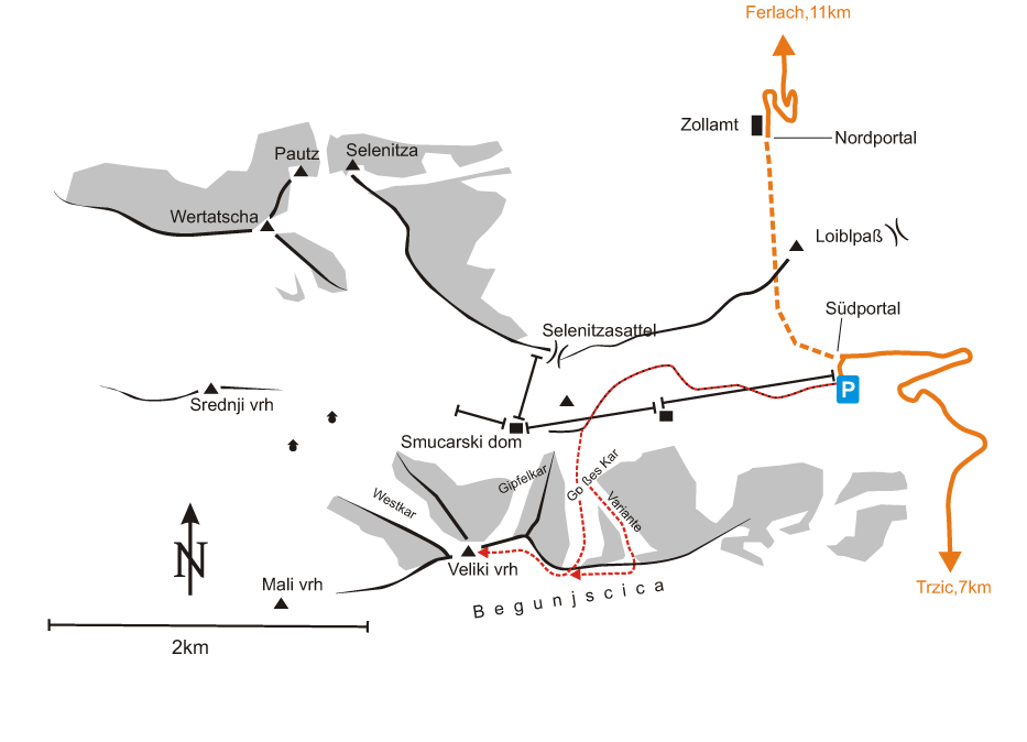 Von Ferlach bzw. Trzic über die Loibler Bundesstraße zum Südportal des Loibeltunnels. Dort 100 Meter nach Süden Richtung Skilift abbiegen und parken.