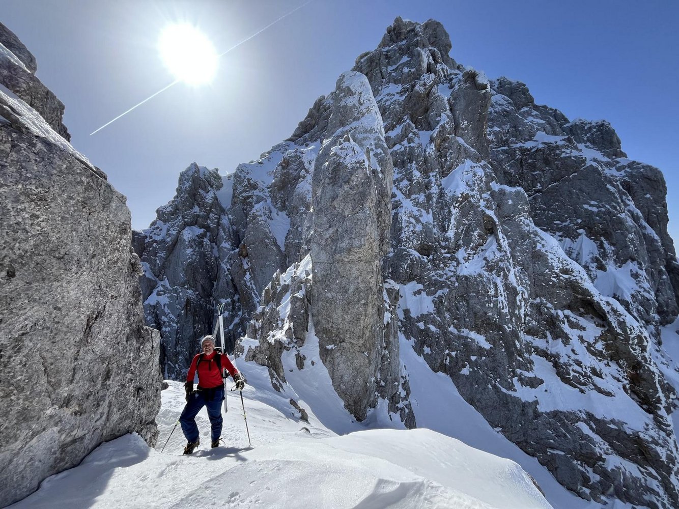 Auch wenn die Rinne nicht übermäßig steil ist (max.40°), könnte man bei Frühjahrsbedingungen Steigeisen mitnehmen.