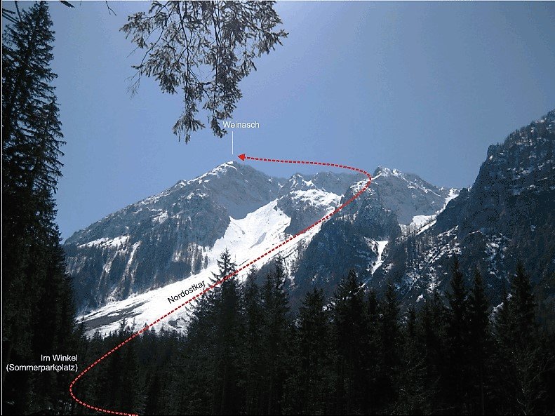 Bei ausreichender Schneelage ist das Nordost Kar auf den Weinasch eine sehr interessante Alternative zum wesentlich stärker frequentierten Anstieg durch das Weinaschkar. Bei dieser Variante legt man weniger horizontale Distanz zurück. Nach einem kurzen Zustieg von der Stouhütte aus legt man rund 900 Höhenmeter am Stück durch das Kar, welches sich nach oben hin zu einer Rinne verengt zurück. Die Hangneigung ist ideal, sie liegt meistens zwischen 30 und 35 Grad, im oberen Bereich nimmt sie dann jedoch zu. Der Ausstieg kann je nach Schneelage (Überwächtung) sehr steil sein und erfordert meistens Steigeisen. Die Abfahrt ist auf jeden Fall ein Highlight.