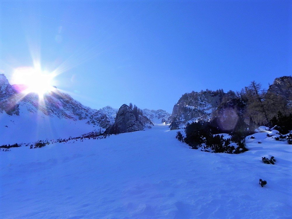 Von der Stouhütte folgt man der Straße in Richtung Klagenfurter Hütte bis zu großen und nicht zu übersehenden Sommerparkplatz. Man quert den ganzen Parkplatz und gelangt an seiner südlichsten Ecke ohne Mühe auf den breiten Osthang des Kares. nach ca 400 Höhenmetern hält man sich auf der rechten (nördlichen)Seite des Hanges, der hier in eine etwa 15 bis 20 Meter breite Rinne mündet. man folgt der Rinne, bis man im obersten Teil nach einer kurzen Rechtsquerung zur Ausstiegswächte kommt. Hier kann man direkt aussteigen und gelangt über unschwieriges Gelände zum Gipfel.