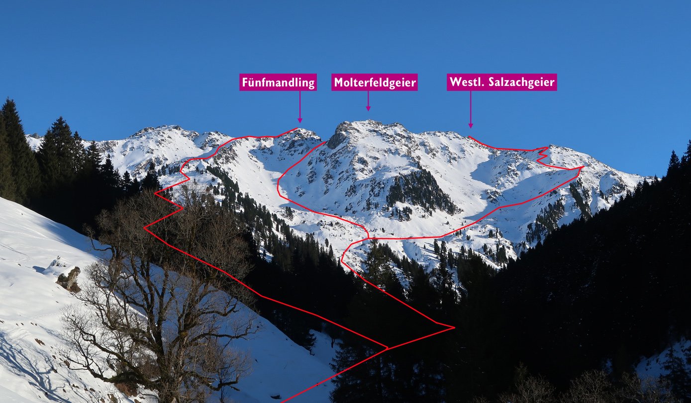 Variante Abfahrt mit ca. 150 Hm Wiederaufstieg: Bei sehr sicheren Verhältnissen kann man auch die Nordwand des Westlichen Salzachgeiers (Vorsicht, div. Felsstufen sind zu umfahren) abfahren und in der Scharte zwischen Molterfeldgeier und Fünfmanding aufsteigen. Von dort fährt man dann durch das sehr steile Kar zur Molterfeldalm ab. Dann auf dem schon bekannten Aufstiegsweg zurück zur Erla-Brennhütte.